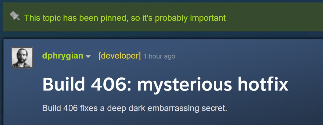 Instead of quietly slipping in the fix, as I would have done, Pittman semi-proudly presents Eldritch build 406.