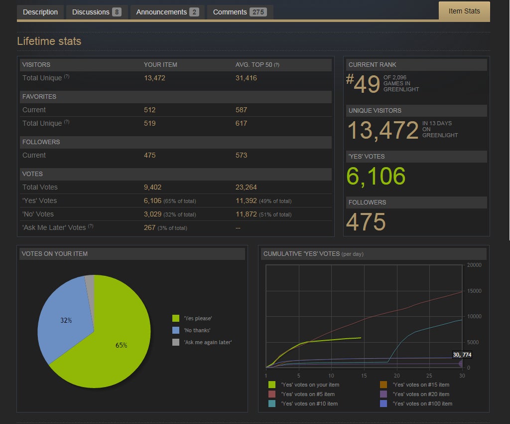 Nonadecimal Creative obsessively checked their Greenlight stats, watching votes per day vacillate and freaking out when database errors caused Steam to tell them they were back down to zero votes. âIt becomes a really frustrating hourly ritual,â they said.