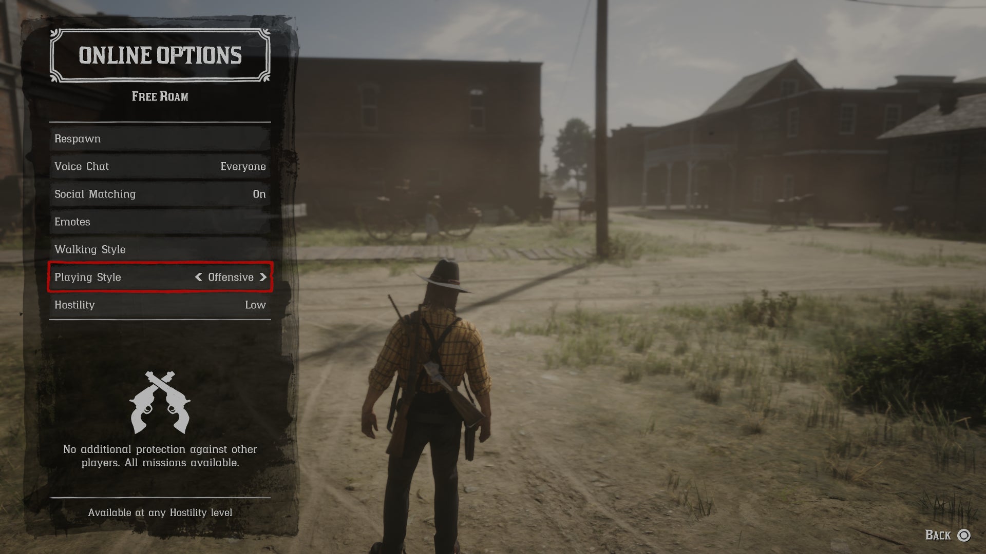 Players can also choose between two new open world modes, either defensive or offensive. The offensive mode in the open world is how Red Dead Online has always operated: Players can shoot you, you can shoot them and you will both deal with the consequences. In defensive mode, players take less damage from attacks, canât be lassoed and canât be locked on via auto aim. Players who attack someone in defensive mode will be punished, and players who attack someone while defensive themselves will be instantly marked as offensive and also punished.
