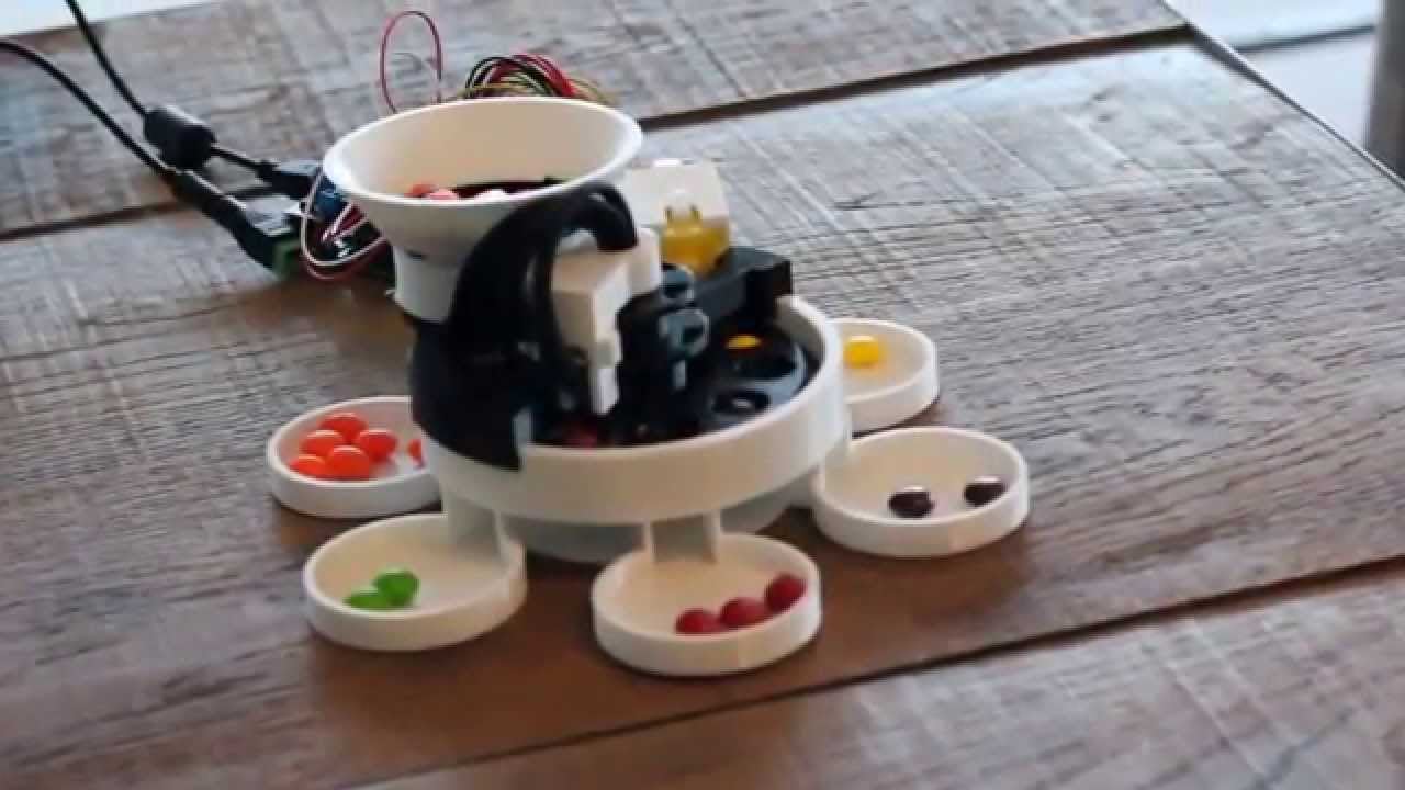 Skittles, sorted by hand? Absolutely unacceptable. The year is 2015 and if someone wants to sort Skittles (or M&Ms) it has to be done with a 3D printed machine, like the one Nathan Peterson built. Everything is 3D printed except for the electronics. It uses a TCS3200 for color sensing. It is powered by 3…