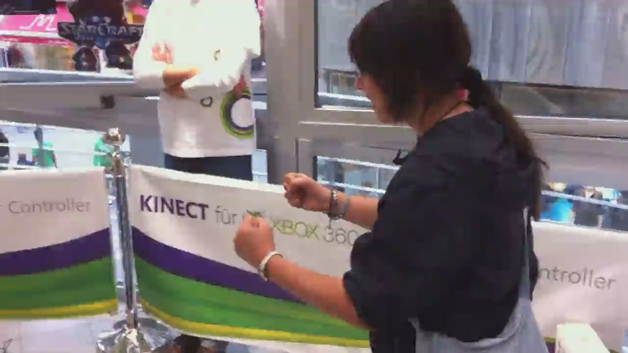 Upstairs at a two-story GameStop in scenic downtown Cologne, Germany, a young woman tries out Kinect, where du bist der Controller I’ve arrived in Cologne a few hours ago, took a brief nap in my tiny hotel room without air conditioning, and then took a stroll through the town, looking for something to spend money…