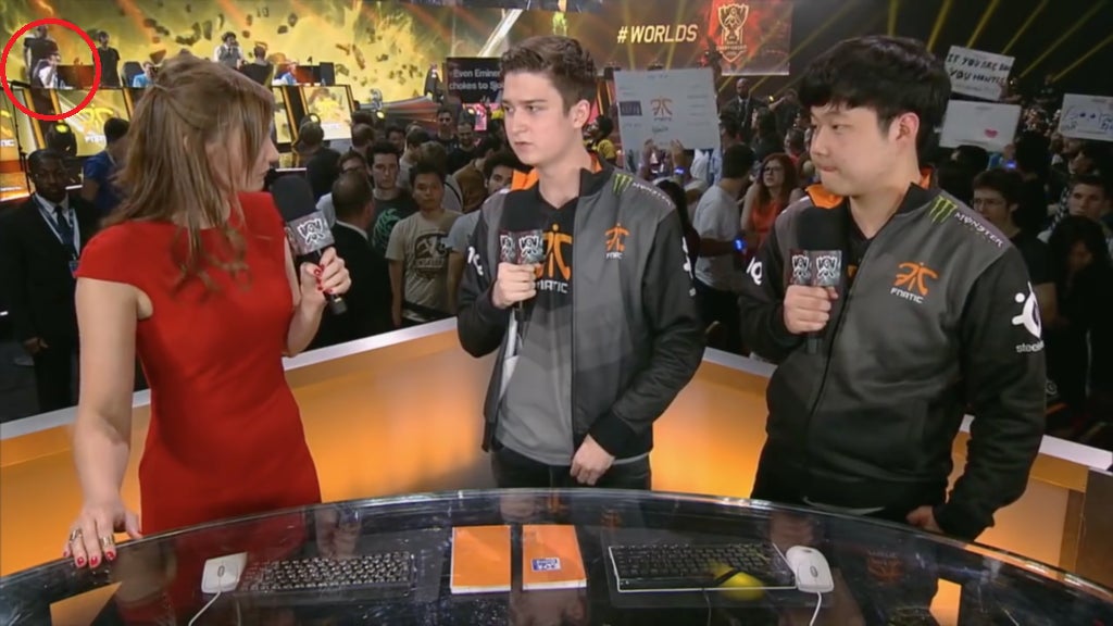 The actual offending act of Hai giving Febiven the finger happened so fast that many League eSports fans (myself included) missed it during the game’s live broadcast. The way that Worlds was structured during the group stage was: after one game was concluded, one or more members of the winning team would head off the game stage for a post-match interview held on a small raised platform close to the front of the crowd. While the interview was being conducted, the next two teams set to compete would be setting up on the main stage.