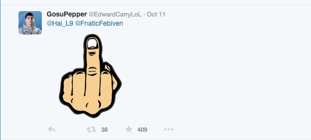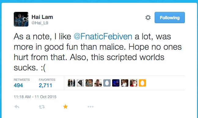 As the video shows, there was an audible response from the crowd around the same time that Hai flips the bird, but it’s not clear if they were responding to him or Febiven’s jab. Either way, despite being such a seemingly small and insignificant moment in the overall scope of Worlds, fans noticed Hai’s gesture all the same. He clarified on Twitter later that day that he gave the middle finger “in good fun,” not “malice”: