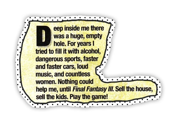 To say I’d been “following the news” about Final Fantasy III would be like calling a serial killer a “bad person.” I had literally two things in my life: anger that Squaresoft wasn’t translating Final Fantasy V and hope that Final Fantasy VI would arrive soon and become the meaning in my life. I’d memorized the exact geometry of every screenshot. I’d written reams of fanfiction in my head about the character sprites. I wore sweatpants and ate macaroni and cheese every day.