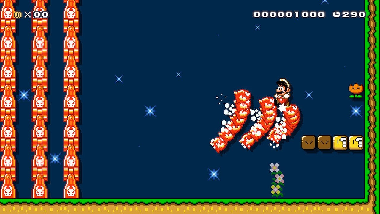 A giant horde of bullet bills chasing you is scary, but once you realize how easy it is to jump on them and climb up towards the exit, this level became a fun scramble to reach the top. Sometimes the bullets would split up too much and I would fall back down, but I had a blast. Even when I failed.