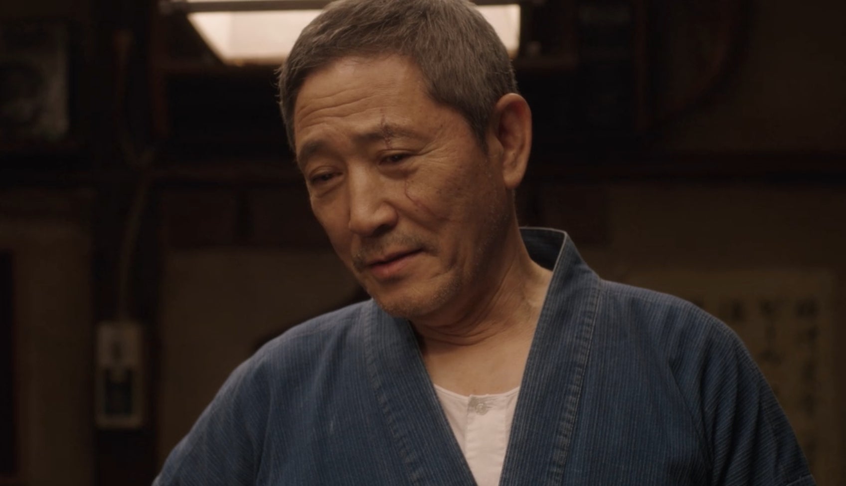 Kaoru Kobayashi, who plays the Master, does a masterful job of conveying emotion in subtle ways. The Master is reserved and doesn’t like to show his concern overtly. He mostly does it by cooking the right dishes at the right time and saying a word or two of advice. He has a scar on his right eye, which is never explained, and his silent gaze often speaks more than his actual words.