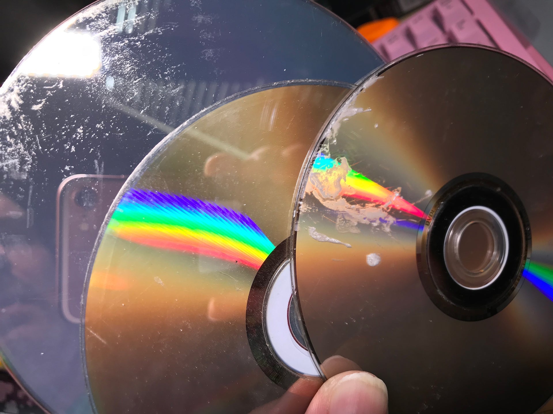 Turning the discs over revealed why they weren’t coming out easily. They were stuck together with … something. I don’t know.