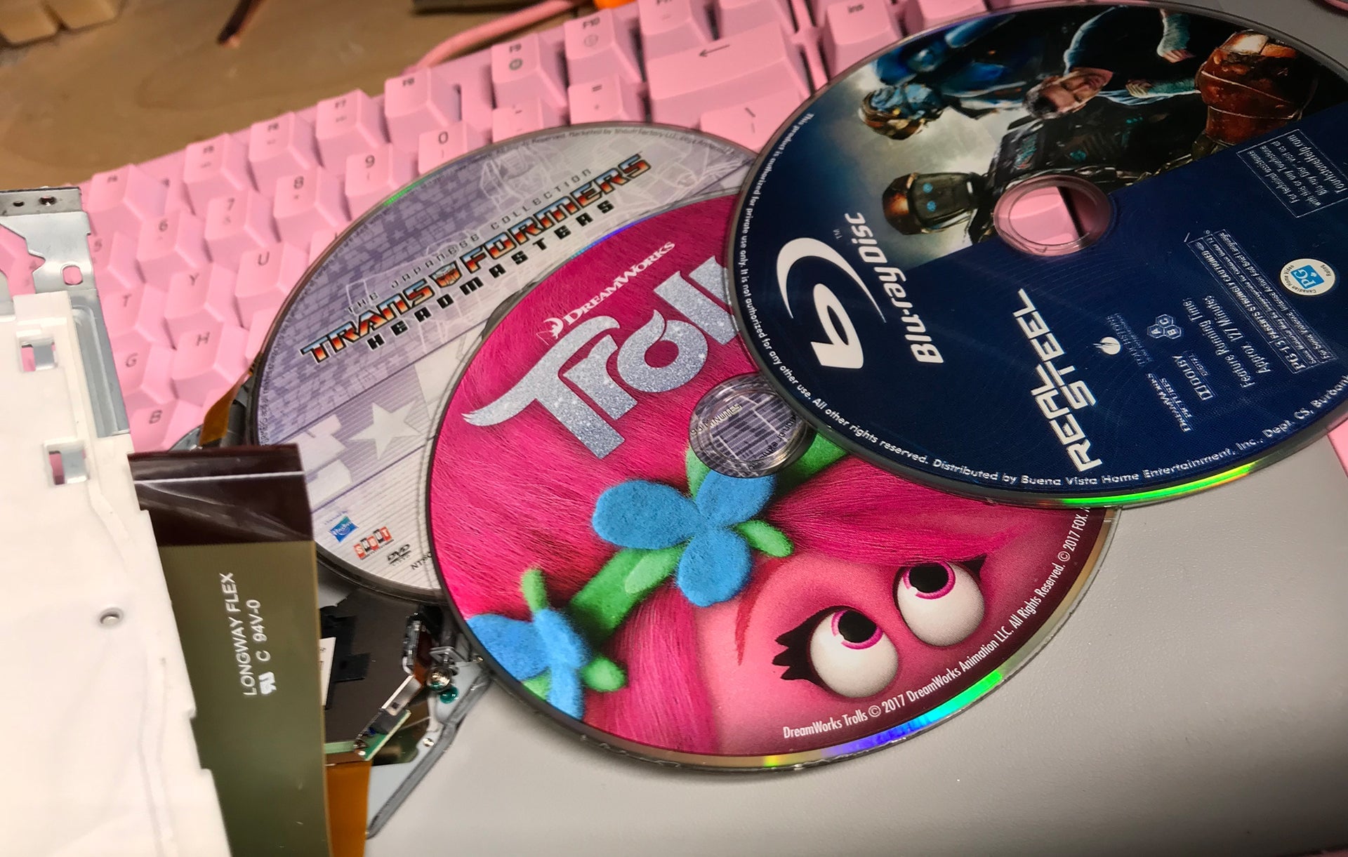 To get them out, I basically had to strip the drive down to nothing, saving the daughter board, which needs to be swapped over to a new drive in order to function properly (hooray, soldering!). Apparently my children were trying to watch Transformers: Headmasters disc 2, Real Steel and Trolls, all at once.