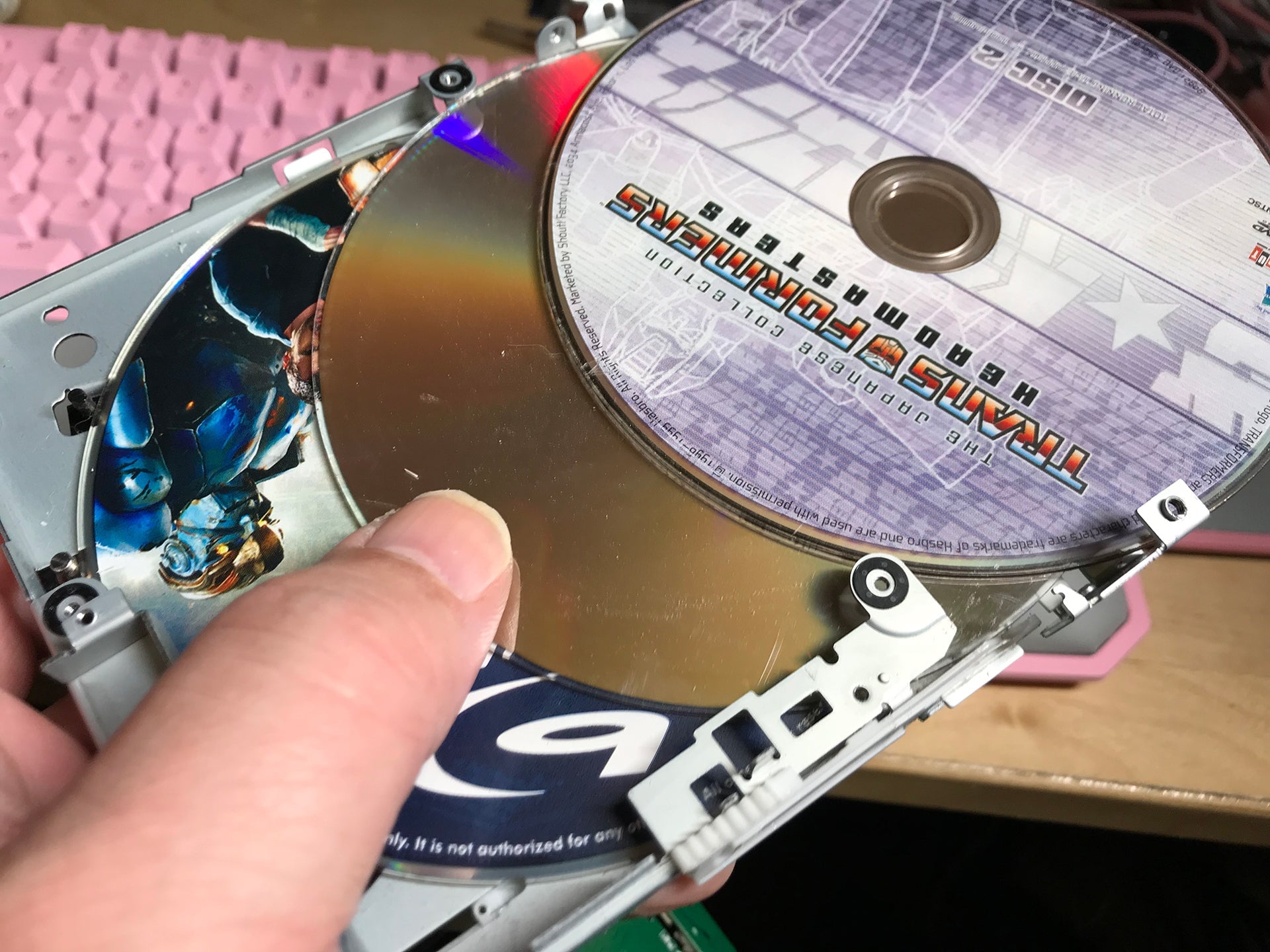 Fine. I could pull the discs out, and everything would be as good as new. Only they wouldn’t come out. The discs were firmly lodged in the drive. To get them out, I would need to repair this Blu-ray drive to death. After a quick check on eBay replacement drive prices ($30, not bad), I tore in. That’s when I discovered there were not two discs in the drive.