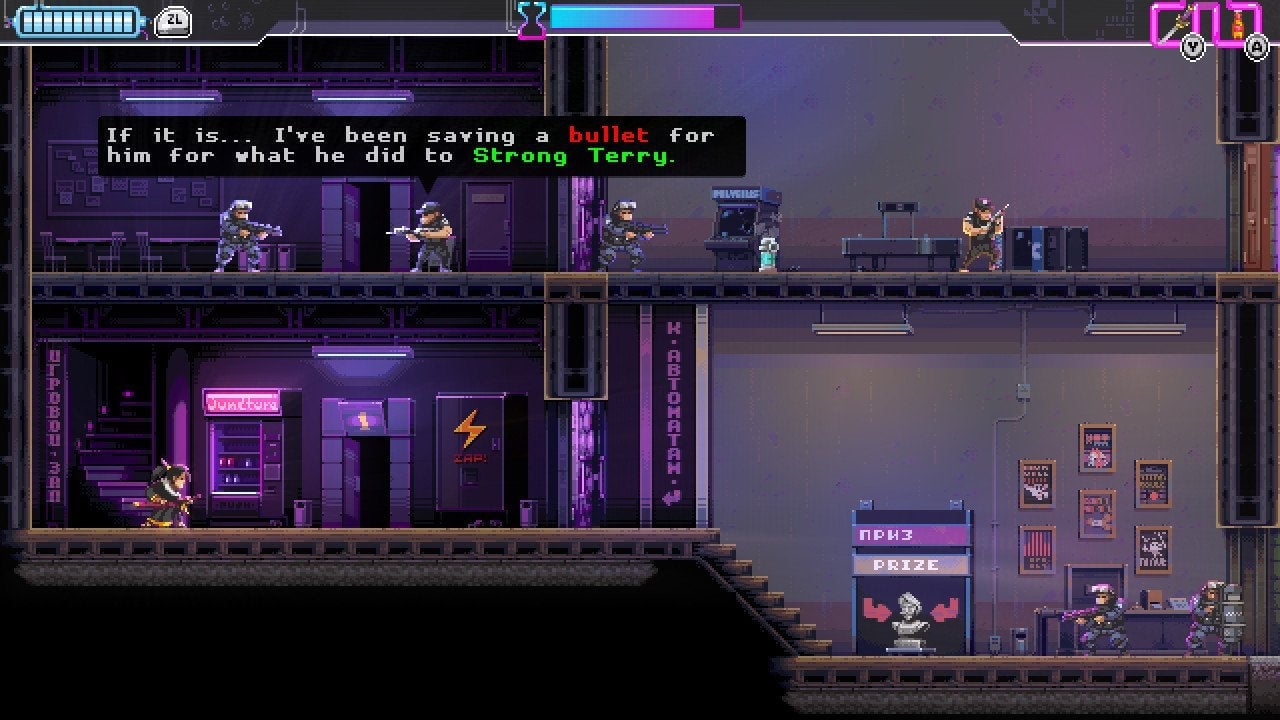 The game does have several smart little touches that more successfully made me care about Katana Zero’s world. Its narrative is excessively dark most of the time, but it balances its tone with humor that is, well, still pretty darn grim. This brings us back to Strong Terry. If you chill outside of rooms before charging in and severing tens of heads from an equal number of necks with balletic grace, enemies will sometimes chat amongst themselves. In one of the game’s early levels, I overheard two baddies arguing over who’d win in a fight: me, the ruthless killer who’d been devastating their ranks, or Strong Terry, the tough guy with a heart of gold who never skipped leg day. I figured he’d be a boss or something, perhaps later in the game.