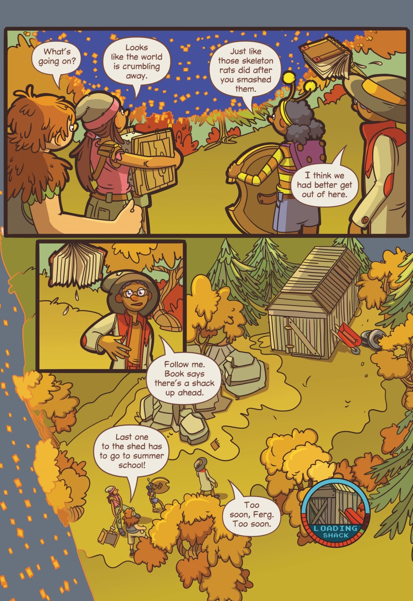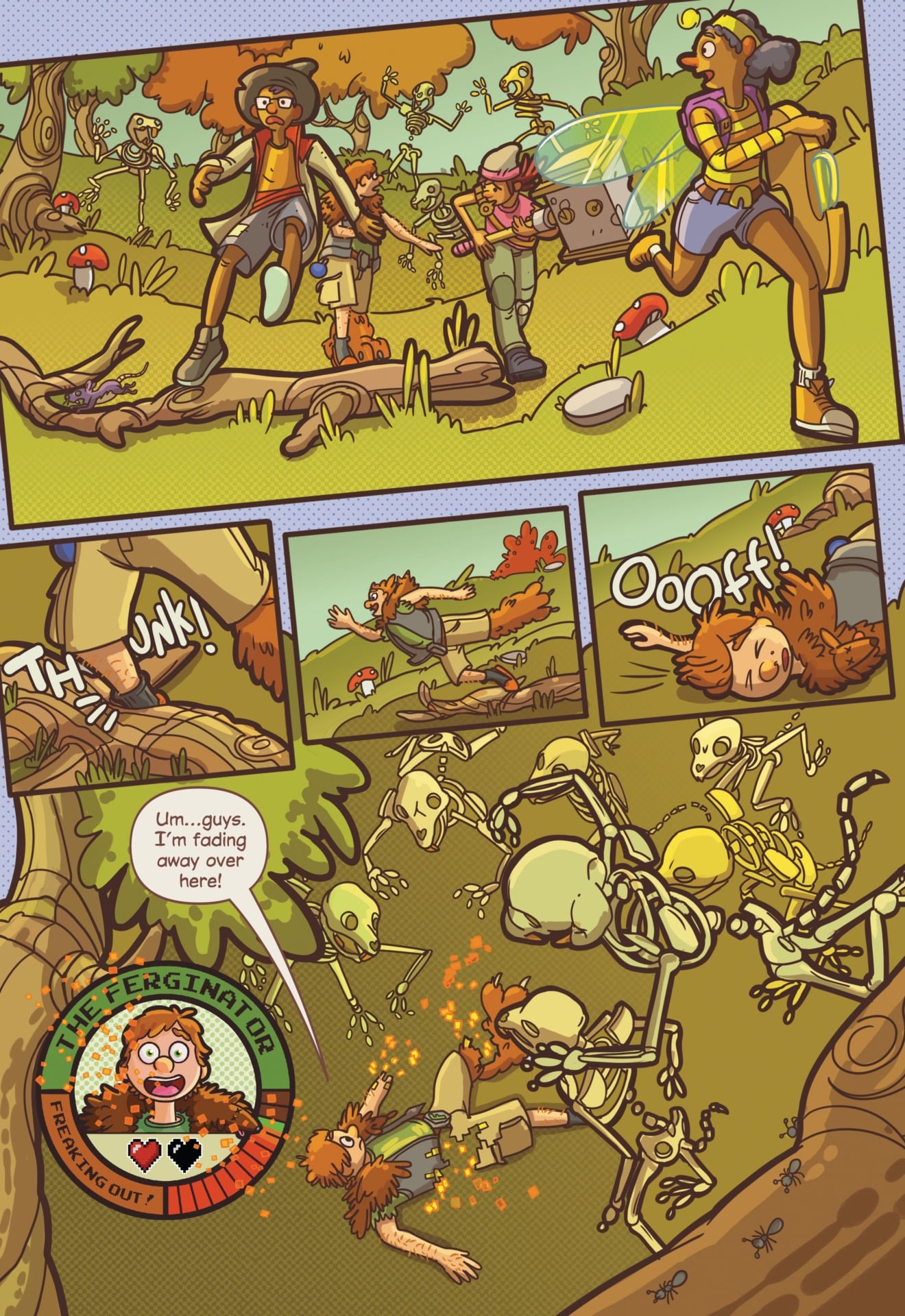 In My Video Game Ate My Homework, a new middle-grade graphic novel from DC Comics and writer/illustrator Dustin Hansen, 13-year-old Dewey Jenkins’ science project is sucked into a malfunctioning virtual reality game console. Dewey and friends must navigate a digital role-playing adventure to retrieve the project and save Dewey from summer school. Check out an exclusive preview of the feel-good comic book adventure below.