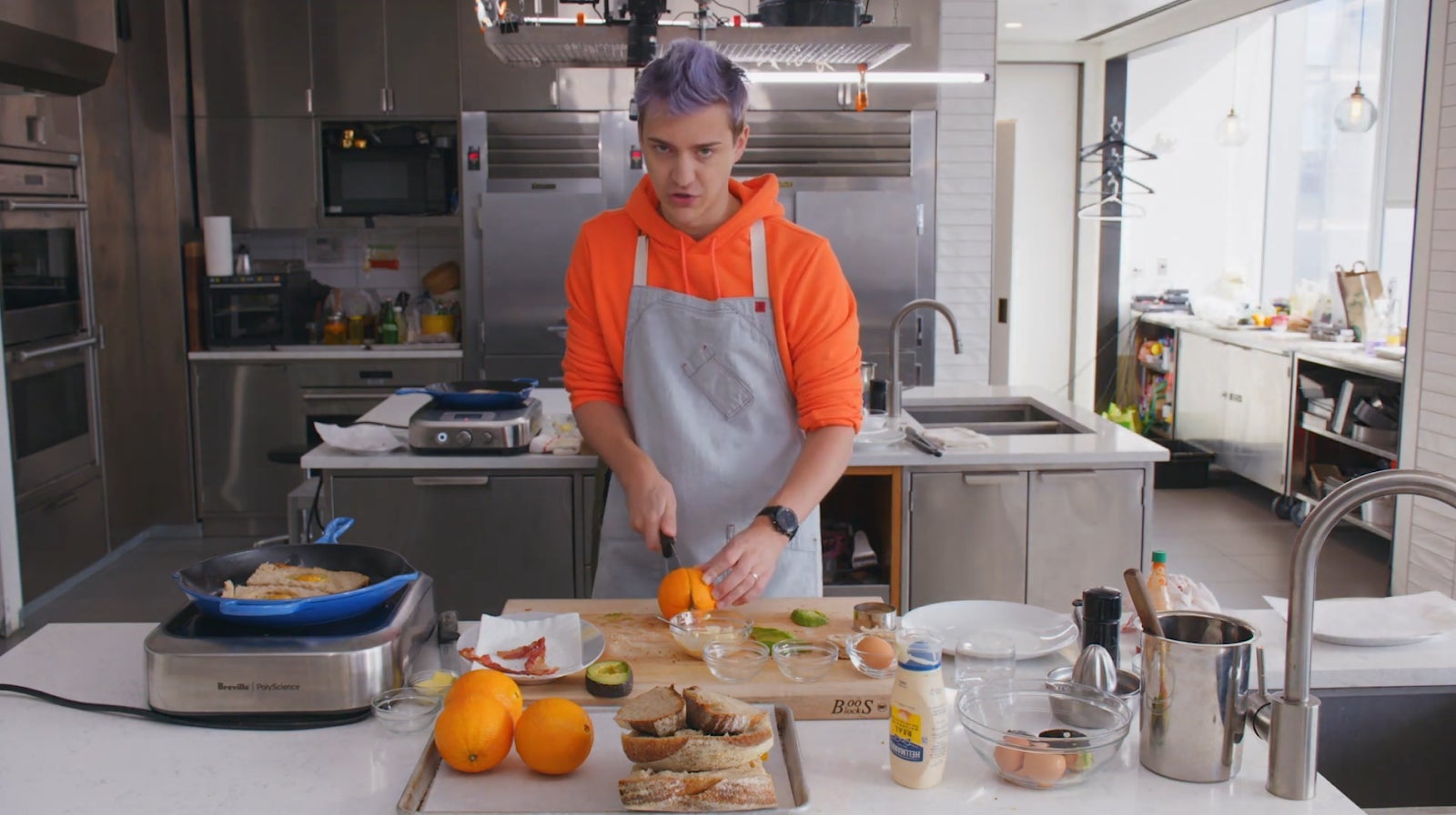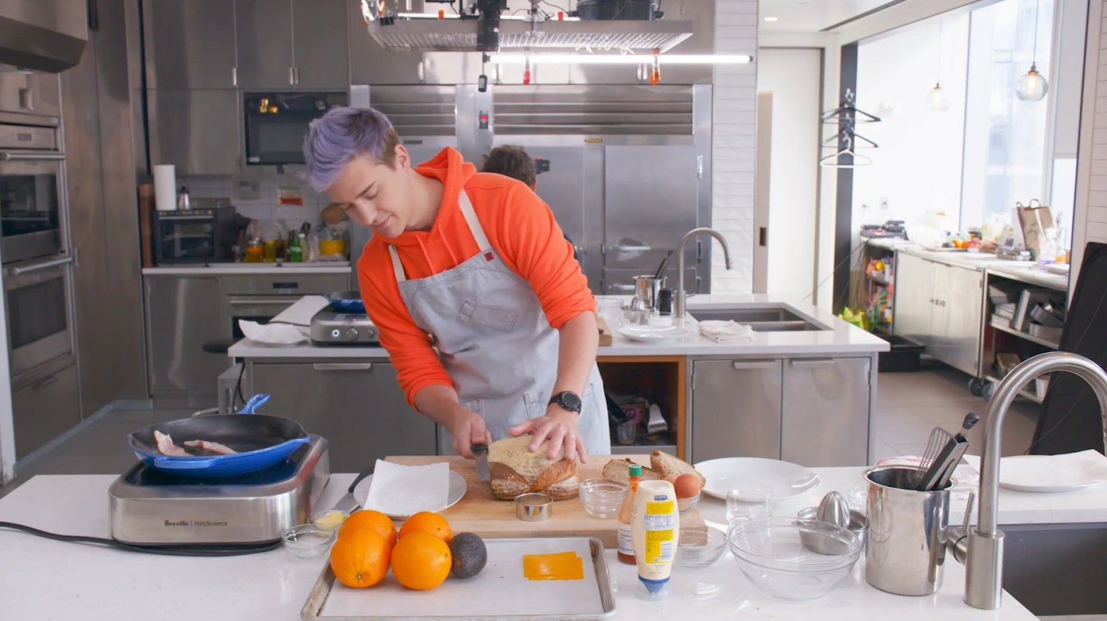 Here we see Blevins, who I stress has lived on this planet for nearly three decades, cutting off the ends of a loaf of bread—not a baguette, or a roll, or another type of bread you might reasonably make a hoagie from—and then slicing length-wise in order to produce the two pieces of bread for his sandwich. In his defense, he’s assuming this is a fancy sandwich. He’s in the kitchen with a professional chef, and I get that might lead to some overthinking. But also, again, it’s a sandwich. It is one of the most ubiquitous foodstuffs in the world. I don’t know what else to say. It’s a sandwich? It’s a sandwich. Two pieces of bread and stuff in the middle. You know, a sandwich. I don’t know what is happening here, but I do know that I find it very upsetting.