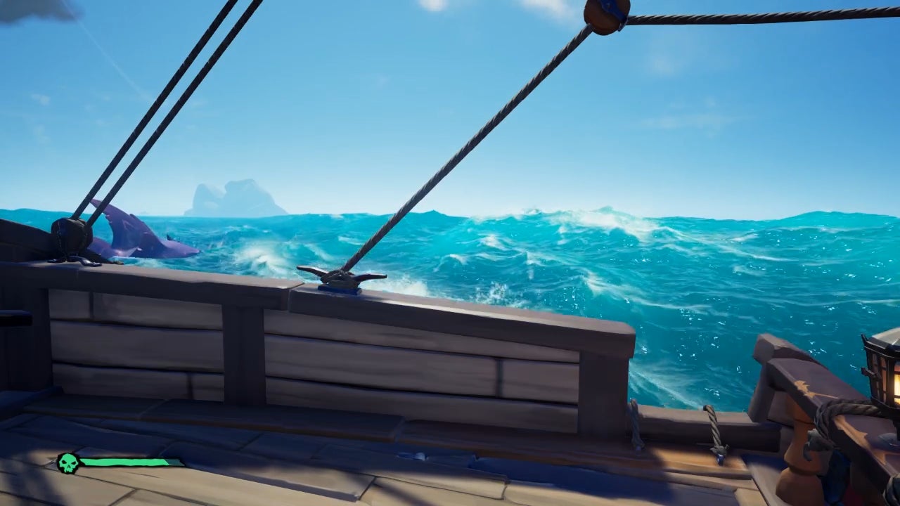 That pretty much describes all of my experiences with Sea of Thieves: mysteriously unmolested despite my sudden desire for a brush with danger. The one time I saw a skeleton ship, a grim and green vessel full of undead enemies, it emerged from the waves with the audacity and ill-fortune of the Titanic. It sailed immediately into a rock twice its size, careened into my sloop, and spun in confused circles while I tilted my sails to the wind for a clean getaway. I continued on to my nearby destination, Rum Runner Isle, with no sign of the ship in pursuit. Thirty minutes after that, a megalodon waved a fin at me as I pulled up to Rapier Cay and, apparently not wanting to interrupt my business, swam off.