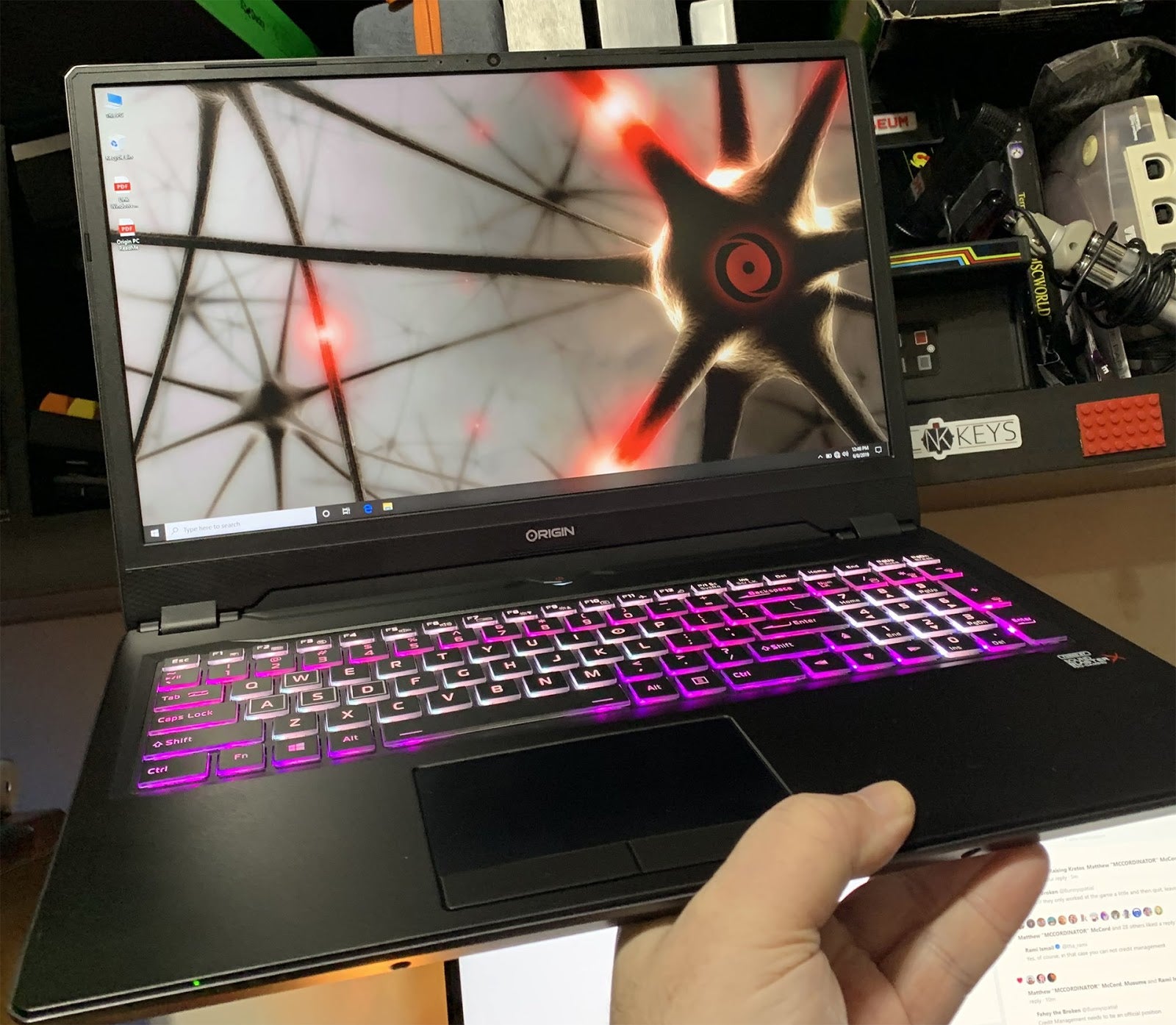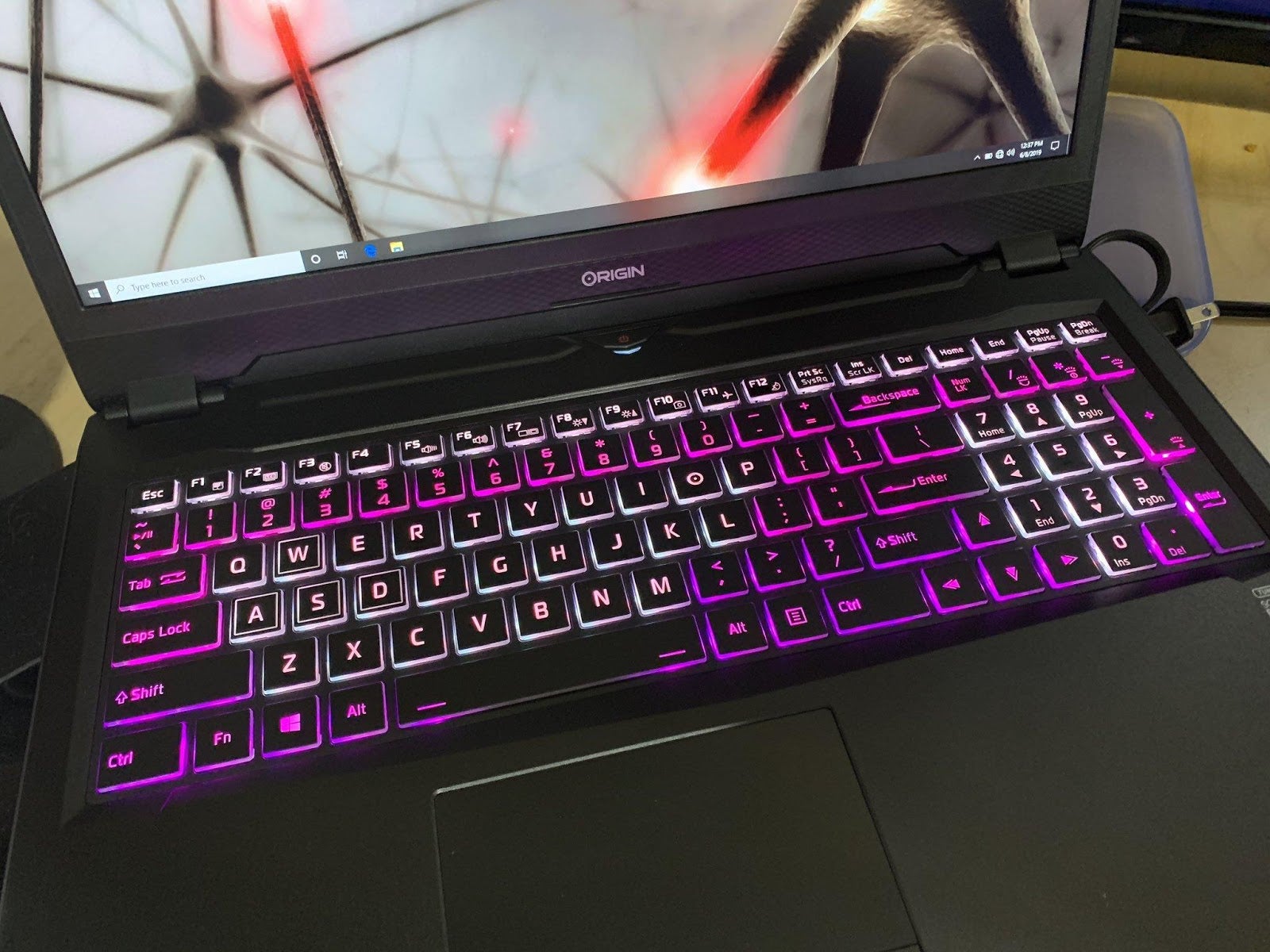 If the image on the unit looks familiar, it’s actually a modified piece of art from the Awesome Max expansion for Ubisoft’s Trials Fusion. The folks at Origin PC just stuck a logo on the horse’s flank and printed away. Not quite the pink unicorn I had originally asked for, but they made up for it by preconfiguring the laptop keyboard’s RGB lighting in my favorite color combo.