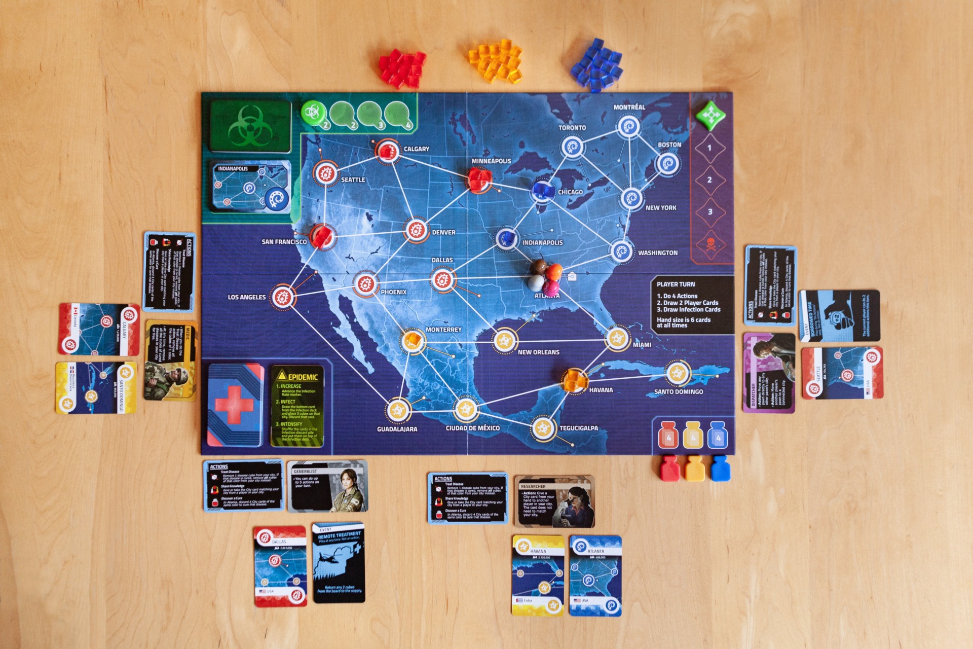 This means that playing Hotzone is pretty much identical to playing bigger Pandemic games, as you travel around North America eliminating outbreaks, researching cures, trading location cards with colleagues and trying to cure diseases before they get out of hand (and you lose the game).