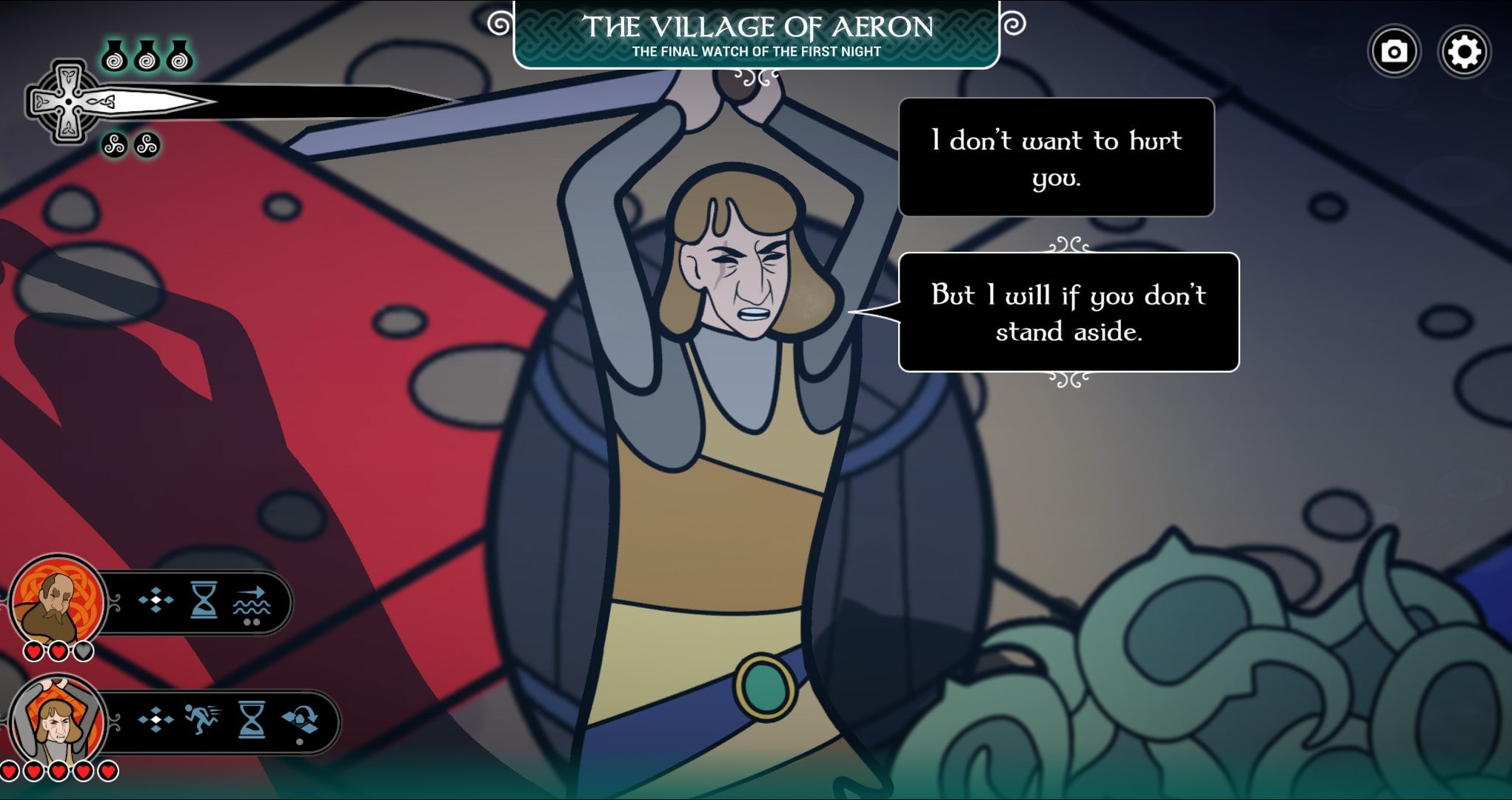 I did not want to harm the villagers, but, turn by turn, they advanced with knives aloft. Each time I used a turn to give ground, Guinevere and my other characters pleaded, saying that all had been welcome in Arthur’s halls, that we were all the same—all just travelers. On several occasions, I thought for sure that the scene would explode into violence, the sort that would be the scripted end to such a confrontation in many other games. But I continued to maneuver evasively, even as my characters’ morale meter drained. Eventually, the villagers lost their nerve. They lowered their weapons and told us to just leave. It was clear that they’d realized they would not find the satisfaction they sought in an ugly, drawn-out gutter battle with my band of disgraced heroes. My characters could not comprehend the suffering these villagers had endured, and no amount of explanation, or violence, was going to get the point across.