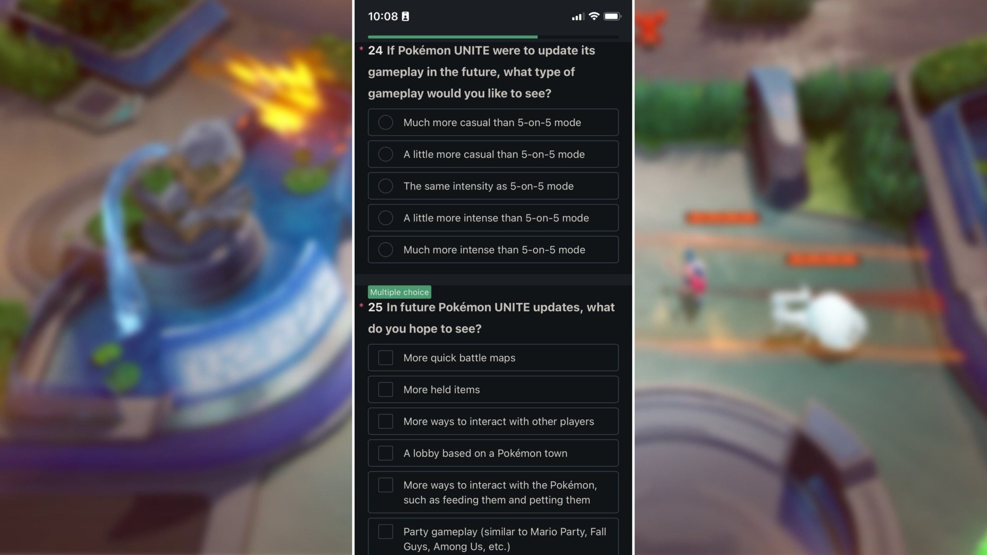 A number of questions the survey asks are quite intriguing. The fifth question, for example, wonders what kind of supplemental content you’d find interesting, with answers including “visual/story content about Pokémon Unite” (maybe like the League of Legends or Overwatch animated shorts) and “E-sports.” Later, the survey asks what you find frustrating about the game, with answers such as “It’s difficult to avoid relying heavily on teammates.”