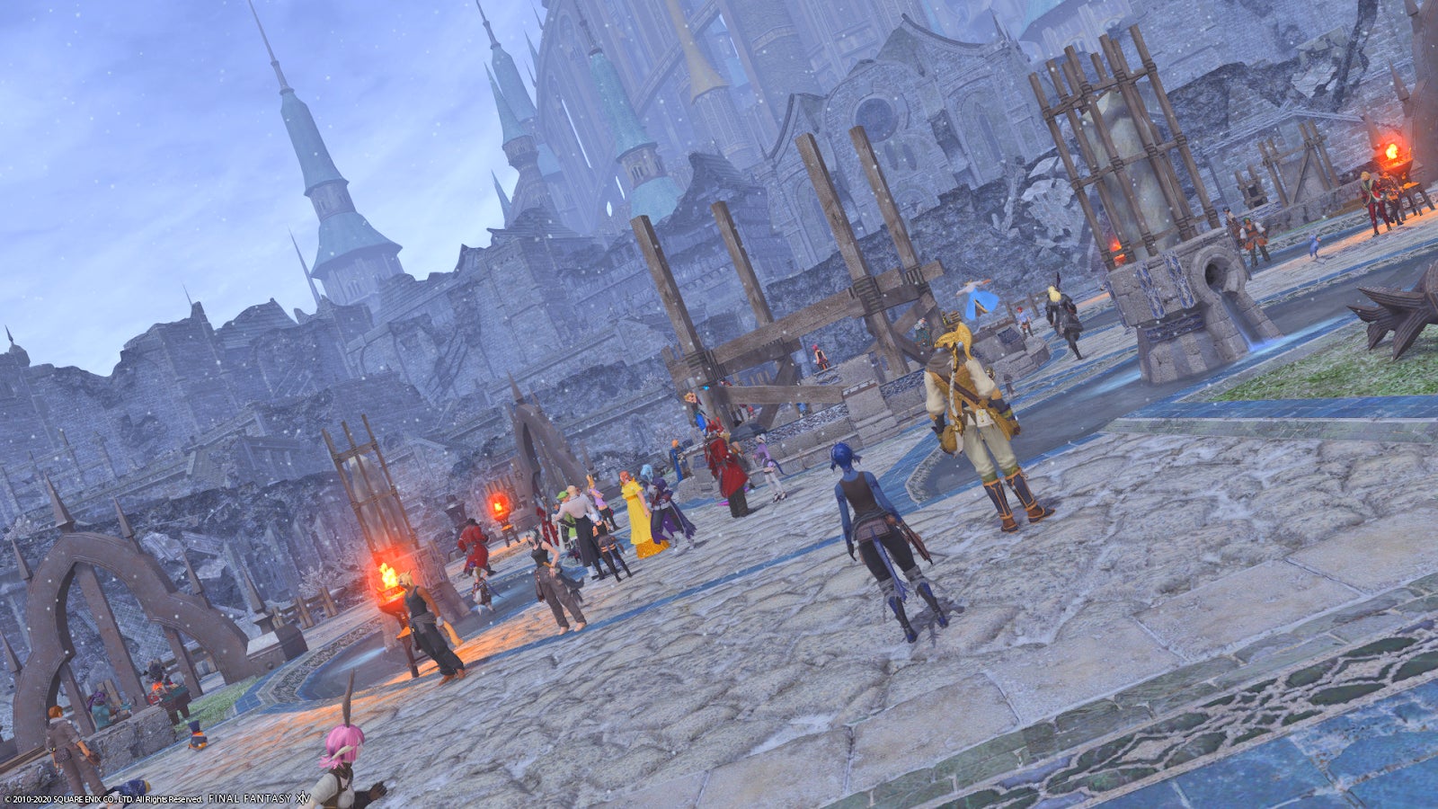 The result has been a remarkably swift and good-spirited effort by which crafters hand out gear to newbies, cooks hand out stat-buffing meals, and gatherers share excess materials like wood and ore with anyone looking for extra. The Firmament, the area of Ishgard where crafting efforts are focused, has become a truly cooperative zone. Rapid response and attentiveness has turned it from a rubble-laden debacle into a cleaner space. The workers’ area is packed with vendor booths and new benches. The central courtyard now has flowers and a fountain. Non-player characters have flocked to the area, wandering around and adding fresh life and energy. The vague consensus among players is that we are building a new player housing district. Housing itself is a major issue in Final Fantasy XIV, because guilds sometimes buy out entire districts. The process of getting a home can take a day sitting at your computer, hoping you’re lucky enough to win a bid or click on the purchase sign before anyone else does. In rebuilding Ishgard, this problem will hopefully be addressed.
