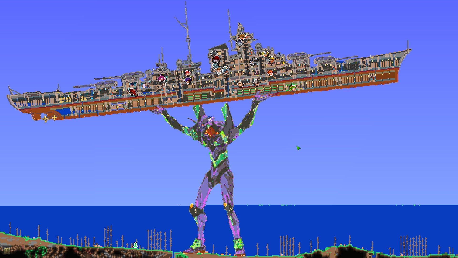 Terraria doesn’t get the same level of fanfare as Minecraft, but its two dimensional crafting is nevertheless responsible from some truly impressive player-made creations of its own. Behold the latest: an Evangelion lifting a warship over its head.