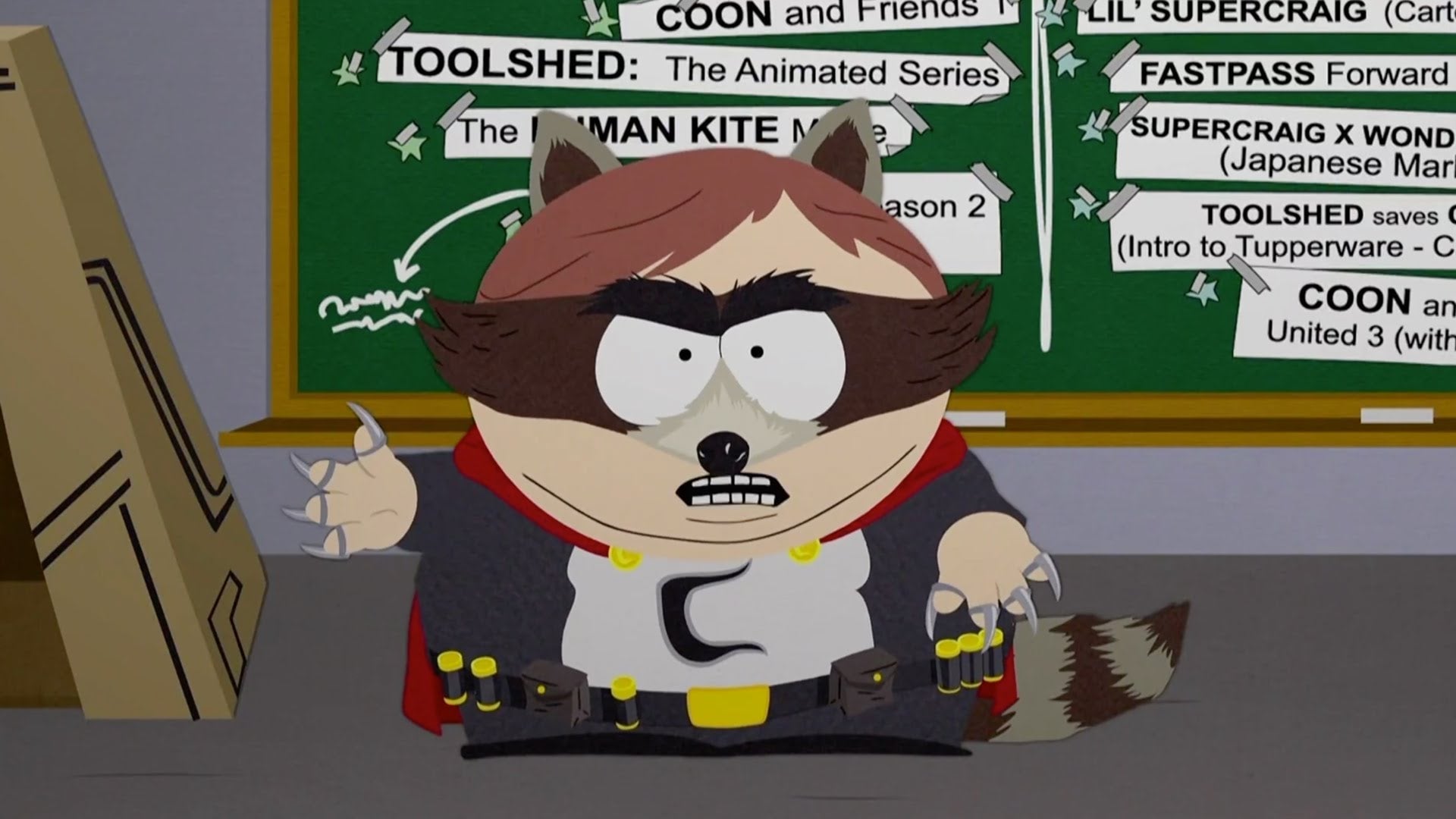 Fractured But Whole, as Parker and Stone explained at E3, takes place directly after the last game, Stick of Truth. The kids have given up on medieval fantasy and are instead playing superhero, as they’ve done a few times on the show, which means adopting secret identities like Coon (Cartman), Mysterion (Kenny), and the Human Kite (Kyle). As we saw in the E3 trailer, the kids had a big argument over when each of their franchises were going to get movies, and then they entered Civil War, which is a good excuse for all the kids to beat each other up.