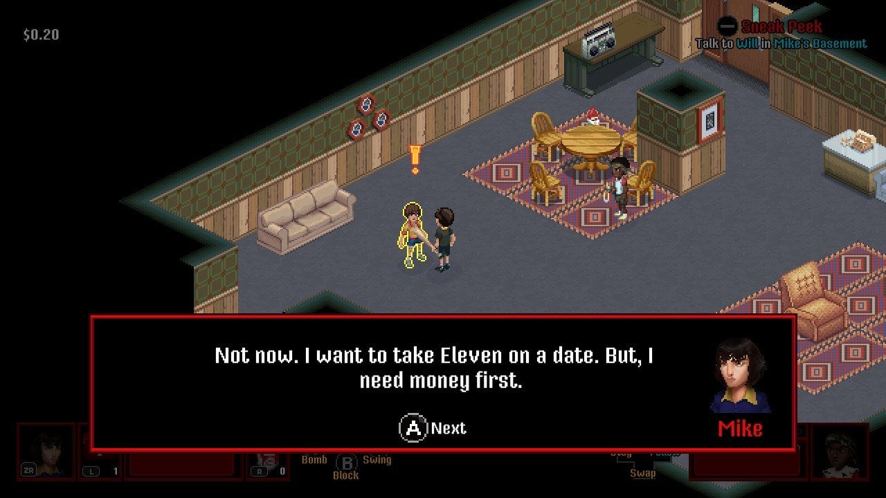 Developed in the style of an isometric action role-playing game, it takes you through the story of the show by giving you quests that take you on a tour of its major landmarks. Now you can beat up rats, solve short puzzles, and complete fetch quests at the Starcourt Mall or the Hawkins Swim Club. At the start of the game you can only control Mike and Lucas, swapping between them as necessary to defeat enemies and overcome obstacles. Each of them has a different attack—Mike uses a baseball bat, while Lucas sports a ranged slingshot—as well as a special attack that costs points of energy to use. As the game progresses, new characters are introduced into the party that have secondary powers, like Dustin’s ability to hack computer terminals, which allow you to reach new parts of areas you’ve already visited.