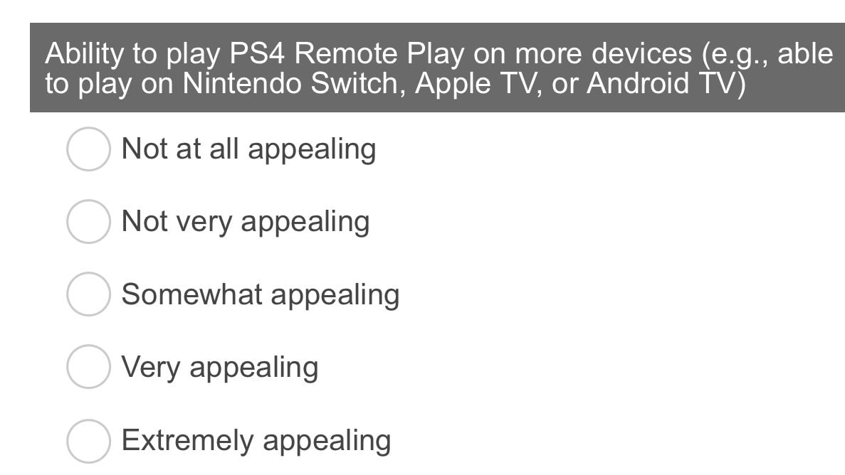 The survey includes a number of questions about which aspects of Remote Play people would like to see change or improve, including whether people would would like the âability to play PS4 Remote Play on more devices (e.g., able to play on Nintendo Switch, Apple Tv, or Android TV).â YouRedditHereFirst shared a screenshot of that part of the survey, as well as several others, over on Reddit.