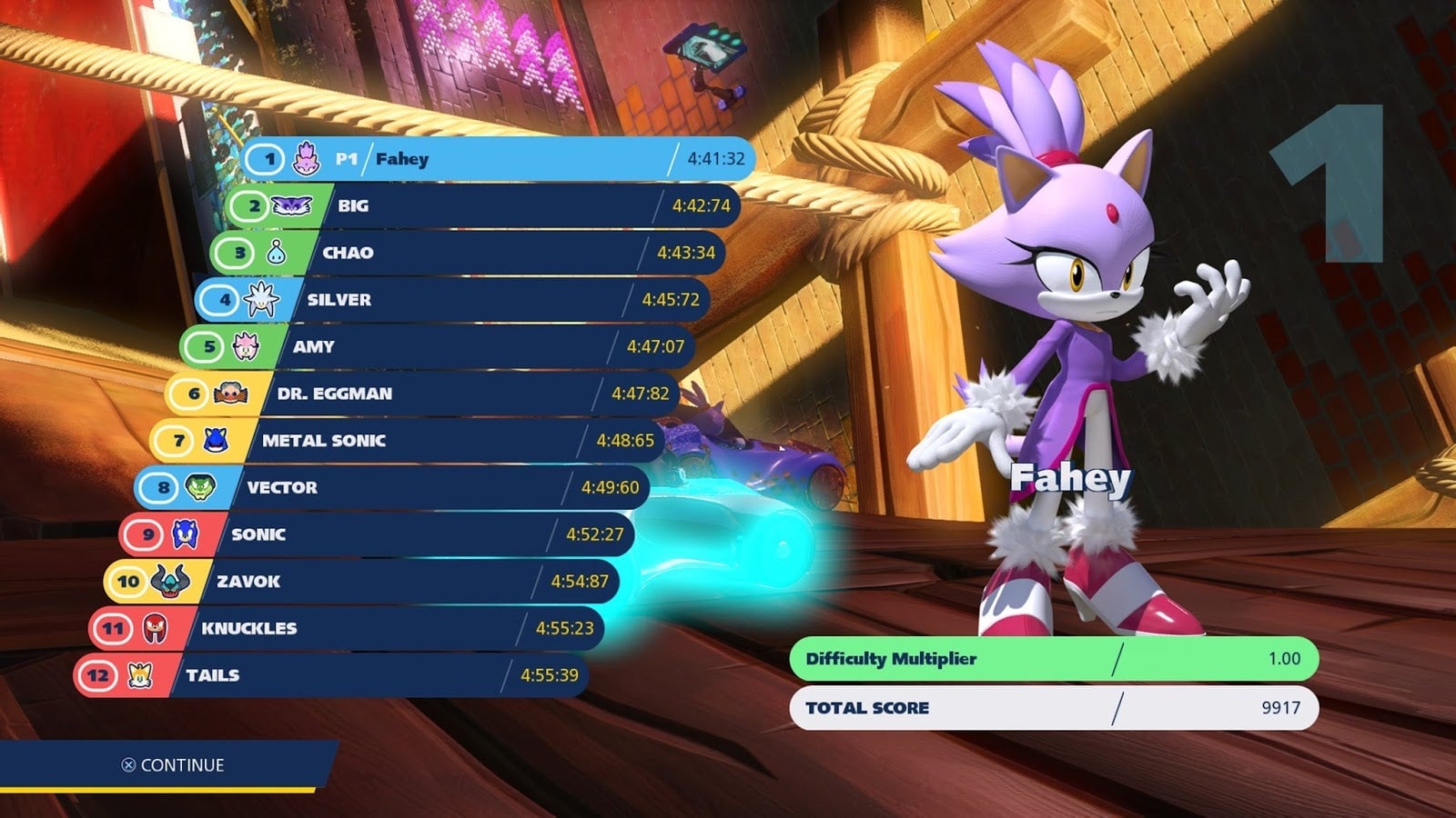 The bulk of my time spent playing Team Sonic Racing so far has been in the single-player Team Adventure mode, which has no shortage of drama. A tanuki named Dodon Pa recruits Sonic and his fabulous furry friends to race in order to harvest the team energy needed to create an Ultimate Energy Engine, a device capable of generating power for the entire world. At first it’s just Team Sonic, consisting of Sonic, Tails and Knuckles, facing off against Team Amy, featuring Amy Rose, a group of adorable Chao and Big the Cat. As the story progresses everyone is joined by Team Blaze, which is the best team. Eventually Shadow, Rogue and Omega show up as well, but who cares because Blaze.