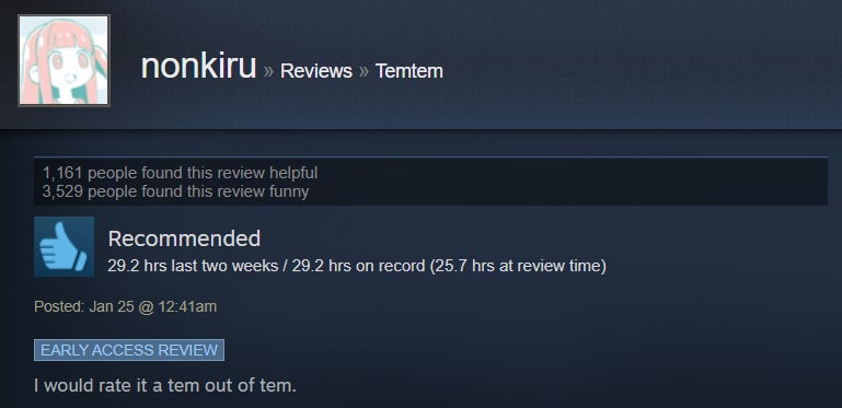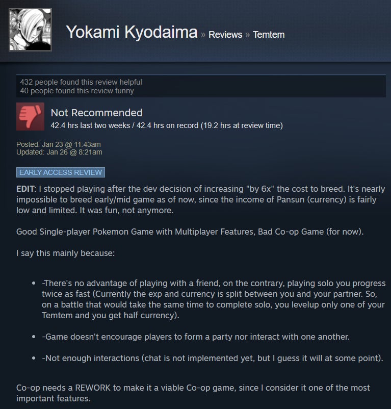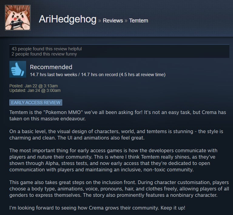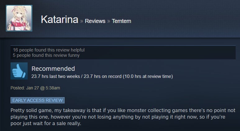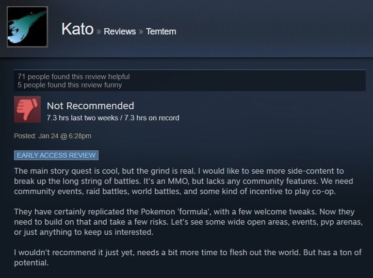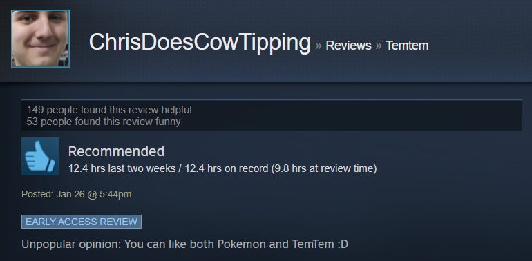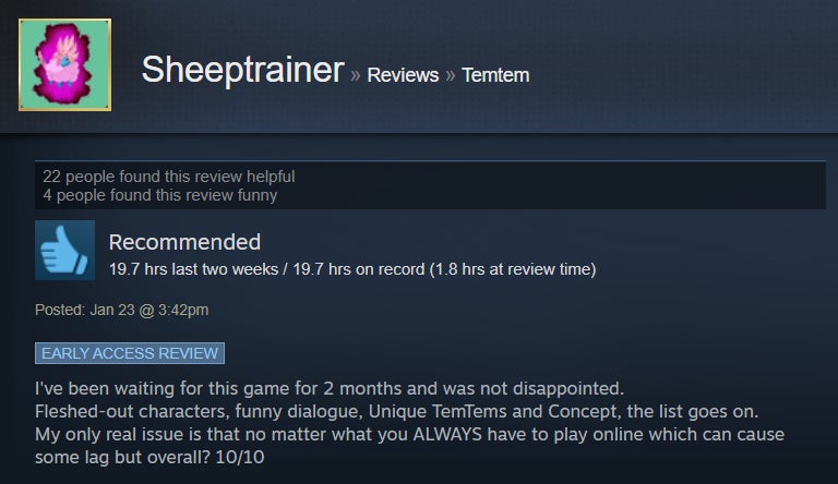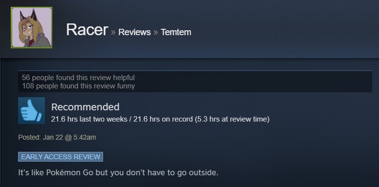 I’ve been dabbling in Temtem for the past handful of days, and while I’ve enjoyed the strategic battle system and higher level of challenge, I’ve found the game’s MMO aspect to be sadly underutilized. The game is in early access, though, so perhaps that will change with time. For now, Steam users are giving it the benefit of the doubt, with many praising its broad adherence to the Pokémon formula and the ways it diverges, like a stamina system and default two-on-two battles. However, some folks aren’t huge fans of the game’s MMO-like grind and lack of online features.