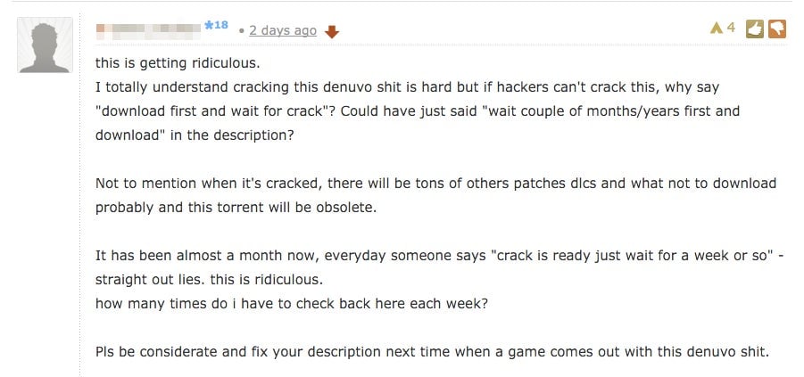 Most torrent websites these days have comments and message boards, and if you take a look at the conversations around Rise of the Tomb Raider or Just Cause 3, there’s a lot of anxiety that Denuvo spells the end of cracked big-budget games.