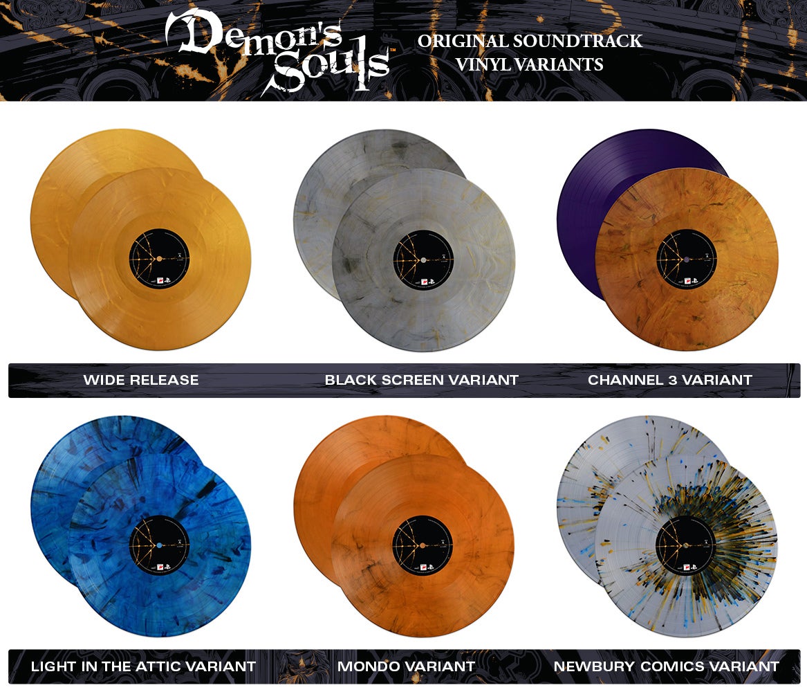 As you can see in the gallery below, the Demon’s Souls vinyl comes in several hues and patterns depending on where you pre-order. But no matter the variant, the entire package is very pretty, with original artwork by Australian designer Ken Taylor.