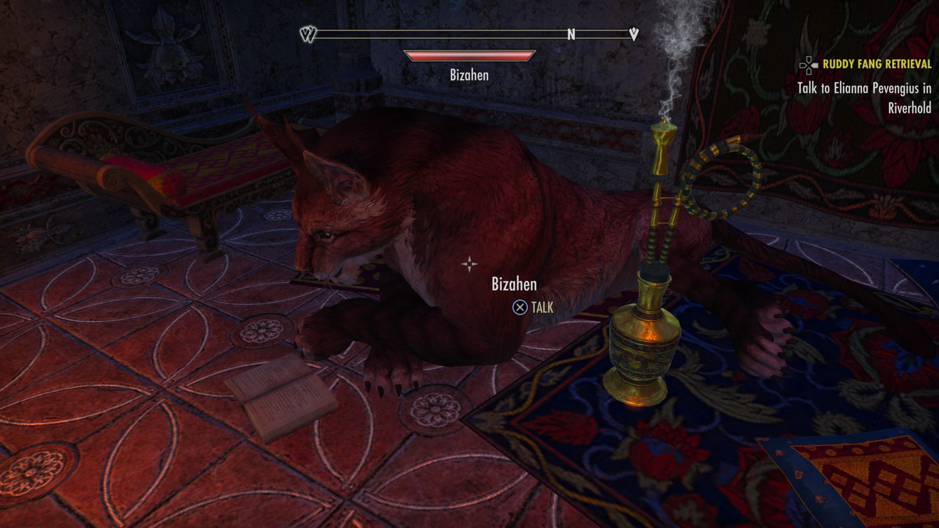The story in Elseweyr is as narratively tight as ESO has ever been. When you arrive in Elsweyr, you’ll find a notice calling adventurers to Riverhold, a small hamlet in Northern Elsweyr. Once you show up, you get the main quest: An usurper queen has used her power to take over the capital city of Rimmen and, you’ll eventually learn, has been subjecting the Khajit to subtly discriminatory policy. Fantasy species as a stand-in for real-world marginalized groups will never be as good a fit as RPG writers seem to think it is, but considering the limits of storytelling in online RPGs, I appreciate Elsweyr’s gesture at depth. Then you get the good stuff: undead hordes on the march. A goofy soul shriven named Caldwell who can walk through portals and seems displaced in time. A disembodied head that might also be Caldwell, but evil, somehow. Also, dragons. Chatty dragons. If you wanted to lay out the Elsweyr trifecta, it’s this: cat people, dragons, and necromancy.