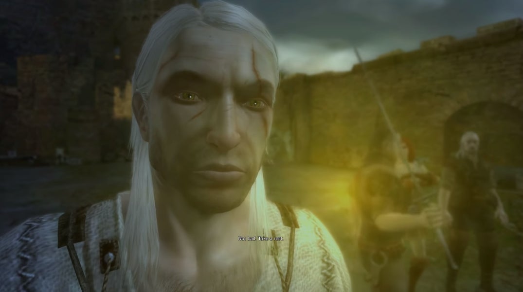 And he’s not the only one who looks extremely weird. The struggle to add as much detail and depth as possible with the tools available at the time has made a number of characters now look creepy. Vesemir looks like a wilted Sean Connery while Triss Merigold looks like a glassy, oblong mannequin. The little bespoke animations and camera flourishes that helped elevate The Witcher 2 and 3 are also missing. The results are clunky and stiff conversations like these: