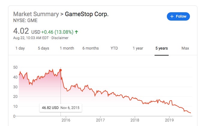 This tidbit of investing advice comes the same week as massive layoffs at GameStop, which has seen its stock plummet over the past four years. The company announced in January that it had given up on its attempts to sell itself, and its new c-suite has been looking to overhaul its business and salvage the company. As more and more people flock toward digital purchases, itās hard to see much reason for optimism, but maybe, just like in the mid-2000s, Burry sees something we donāt.
