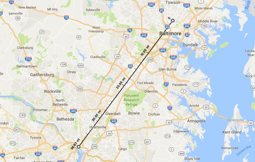 Pidgey to Pidgeot: 62 km (the distance from Washington, DC to Baltimore, MD)
