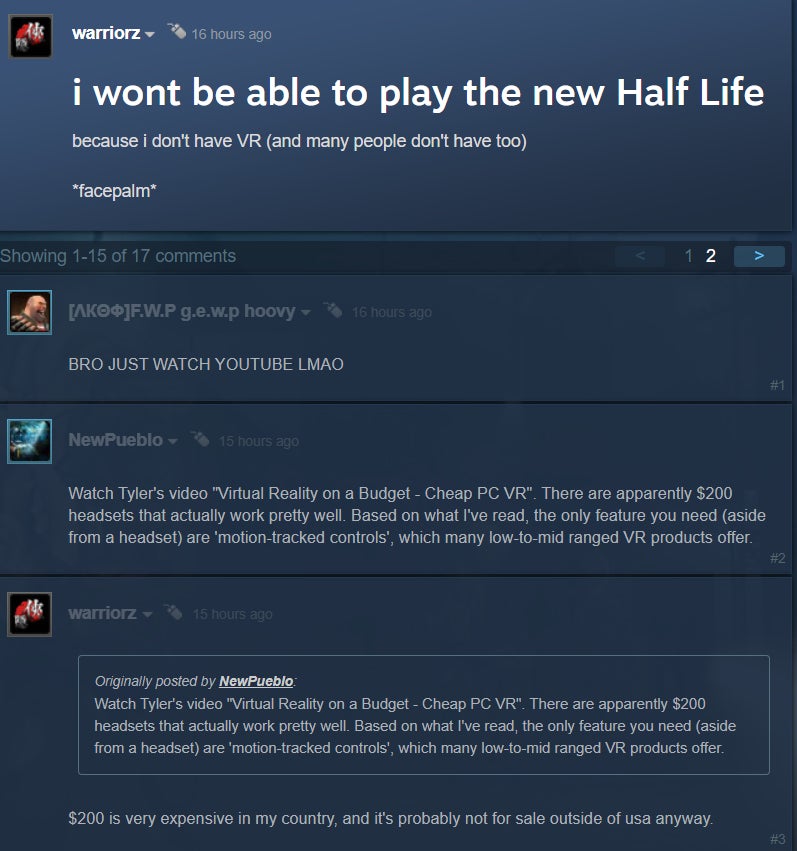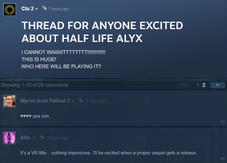 Half-Life: Alyx, announced yesterday by Valve in what still feels like an impossible fever dream but was actually just a post on Twitter, is set to be the companyās āflagship VR game.ā This has left fans in an odd spot. On one hand, itās more Half-Life. Finally! After more than a decade of waiting. On the other hand, itās not Half-Life 3, and on top of that, itās a VR game, meaning itāll require an expensive headset and a powerful PC. While it makes sense that Valve would want to create a killer app for its Valve Index VR platform, itās still been a bitter pill to swallow for some of the Half-Life seriesā vocal fans. Hereās what theyāre saying: