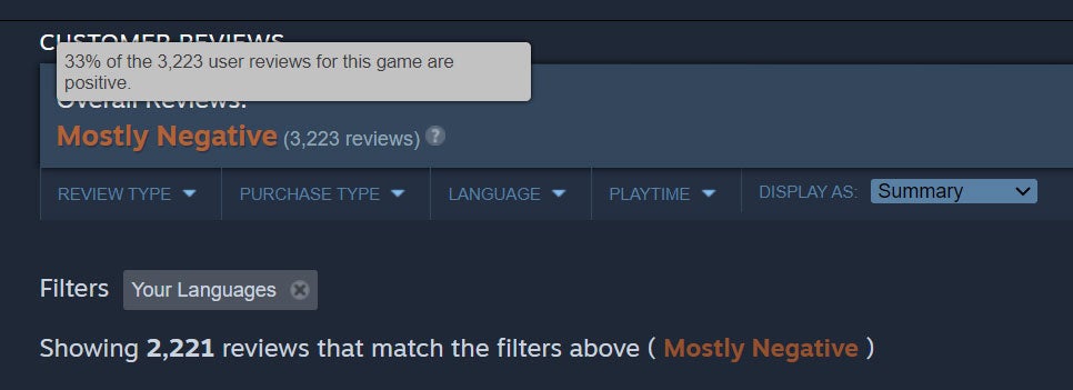 At time of posting the game only has a 33% positive rating on Steam, a figure and timeframe that has little to do with the quality of the game itself, and everything to do with the condition it has released in. Player’s complaints are many, but they boil down to a few widespread issues like: