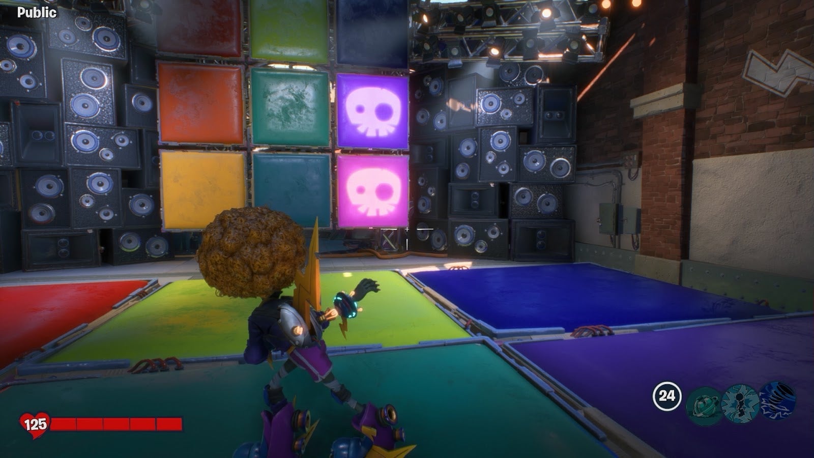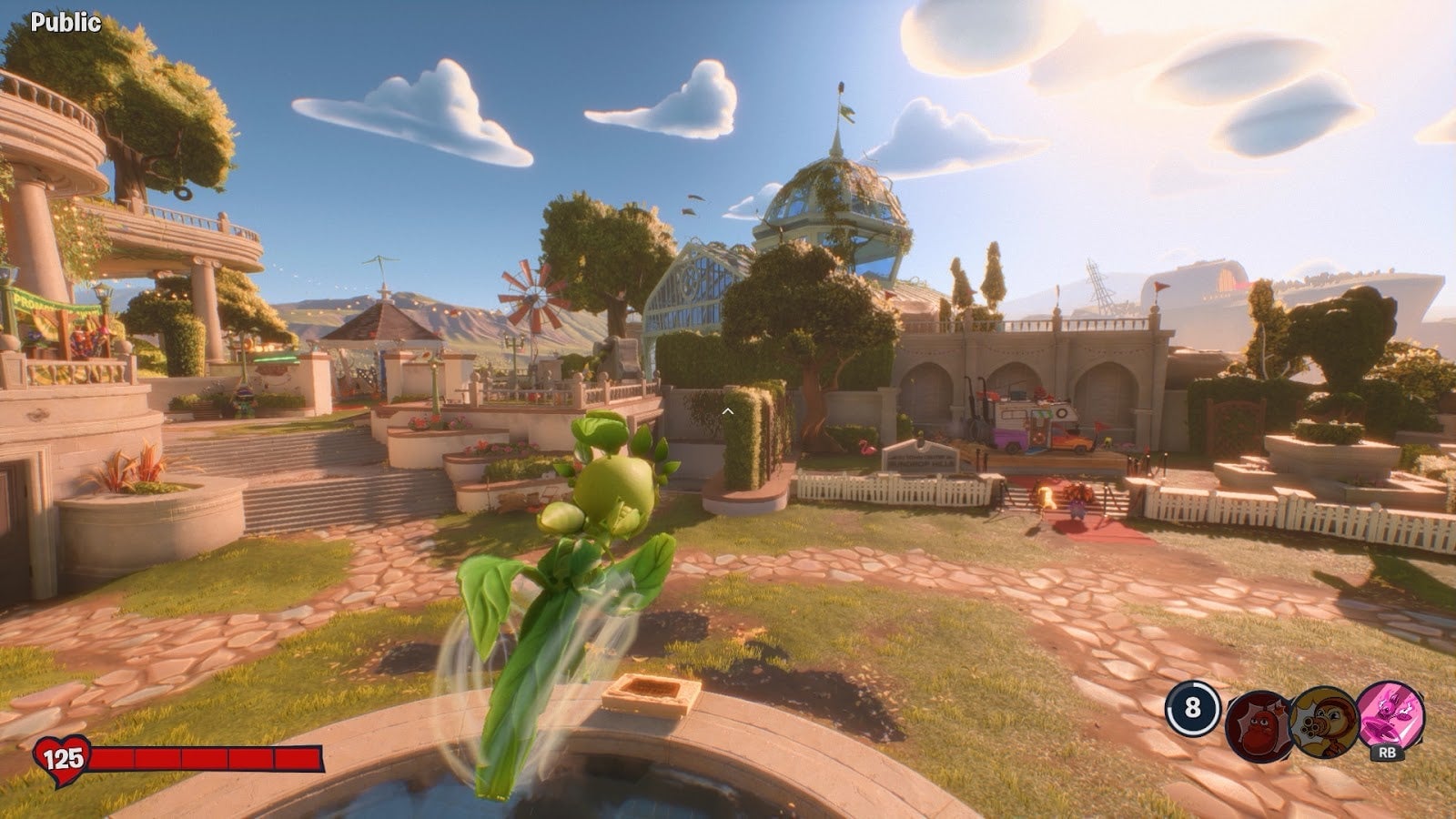 So far, I’ve been having the most fun in Town Center, the plant-based adventure zone. It’s almost like being in a third-person Plants. Vs. Zombie role-playing game. It starts with a mission: a sunflower assigns players to help get rid of zombie machines that are causing plants to dance uncontrollably. Players must seek out an underground dance club, recruiting non-player plants to their side along the way. After that, there’s an escort mission in which the player and his posse must defend a lawnmower, which seems like a conflict of interest. It’s a fun little solo story in this only multiplayer shooter, and it’s the first of many.