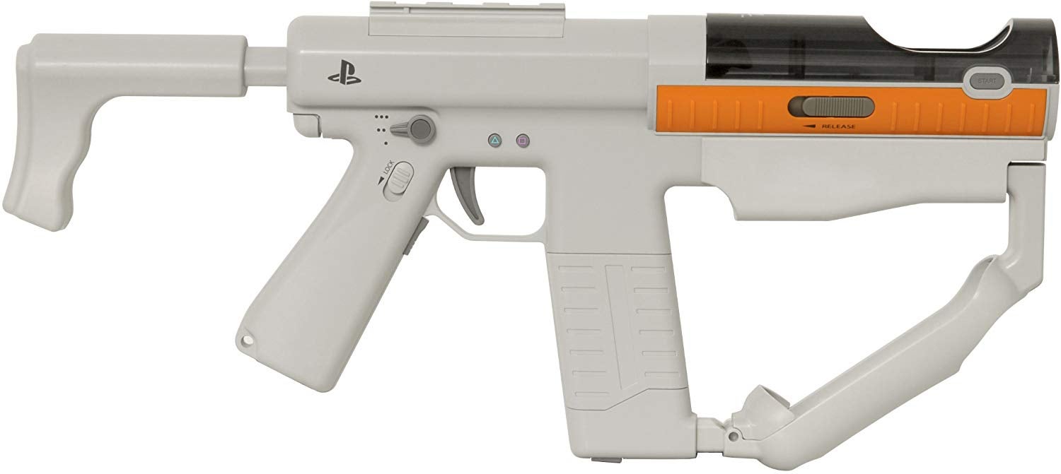 A kid using a PS3 Sharpshooter and PS3 Move Controller as a weapon.