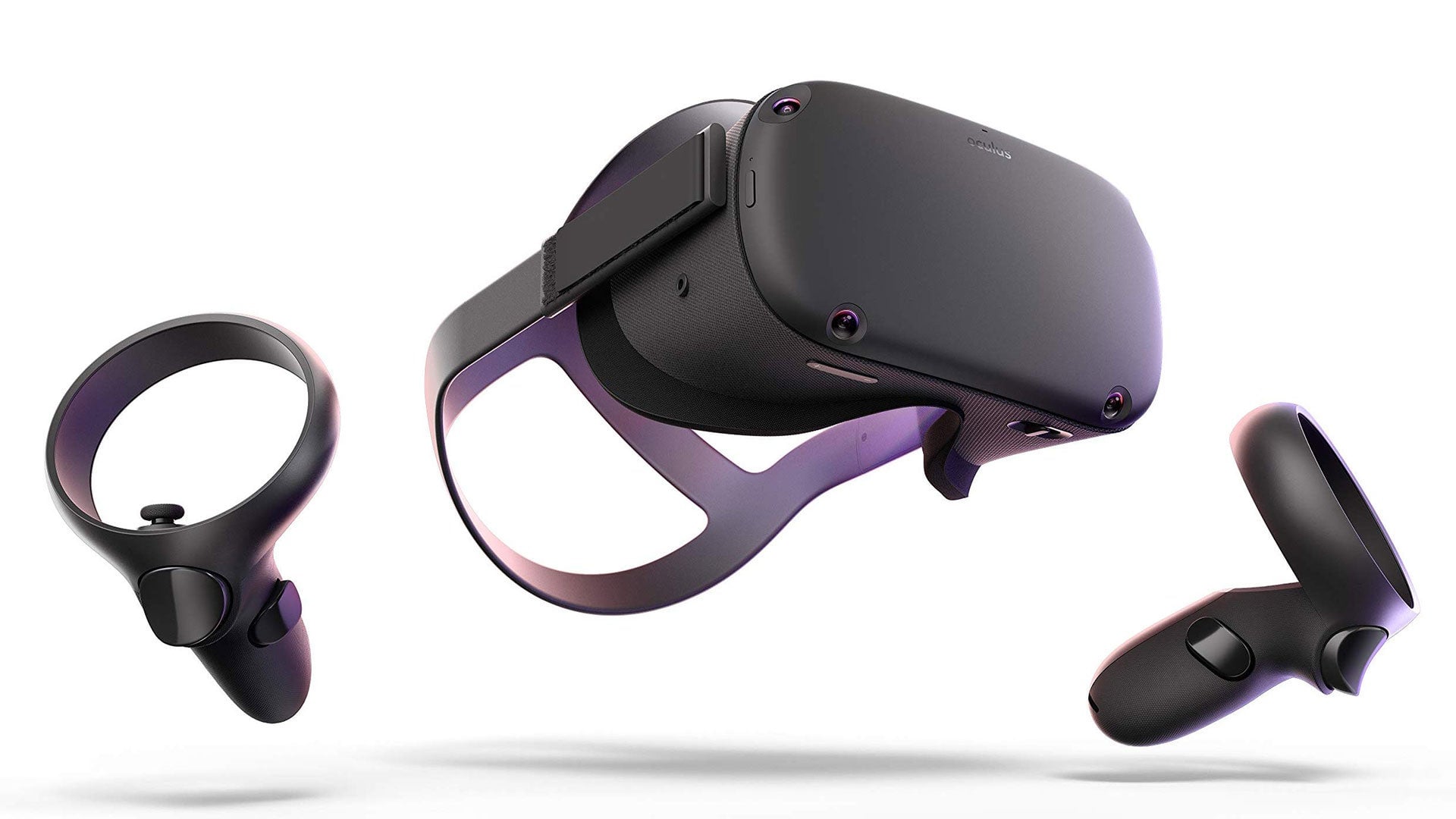 There’s not a lot inside the Oculus Quest box. There’s the headset, an understated design wrapped in textured cloth. The front is matte black plastic with four cameras in the faceplate’s four corners, which are used for the headset’s inside-out tracking. There are a pair of redesigned Oculus touch controllers. The original controllers had rings on the underside to be tracked by external sensors, where the new ones have rings on top so the headset cameras can track them. There’s a pair of batteries for the controllers, a face spacer for users with glasses, and a single wire—a USB type-C charging cable.