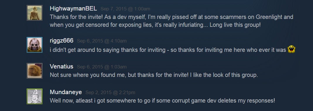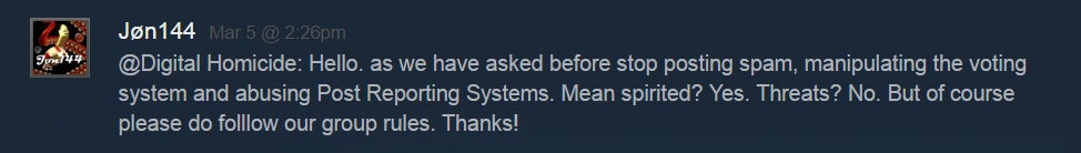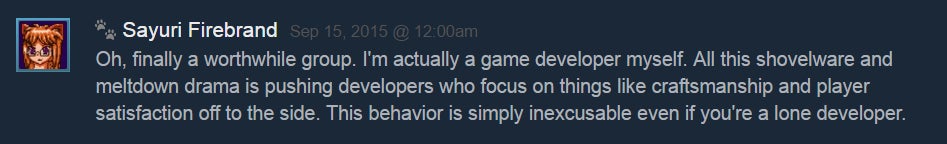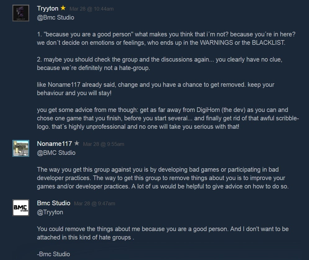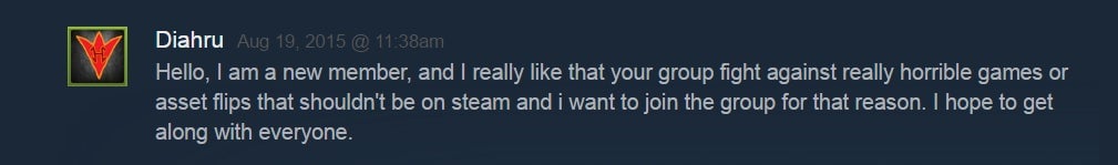 âWe voice our opinion, and when devs are âcaught in a lie,â they act angrily,â he added. âBut the users on Steam can check out the group and our rules and see that weâre definitely not the bad guys here.â