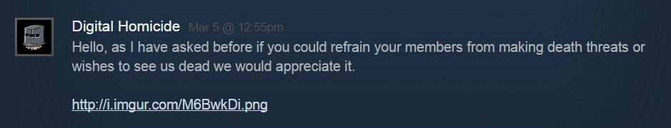 When youâre running a group that leverages numbers for strength, drawing lines of responsibility becomes a tricky thing. Nobodyâs perfect, and in large groups, some individuals will invariably take things too far, especially when they feel like they have more than a thousand other people behind them. The Digital Homicides are clearly aware of this, and theyâve posted many stern (though non-specific) warnings in instances where somebodyâs decided that outright harassment is a good idea. The moderators even had (developer) Digital Homicideâs back shortly after the lawsuit fiasco began.