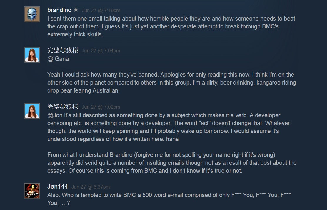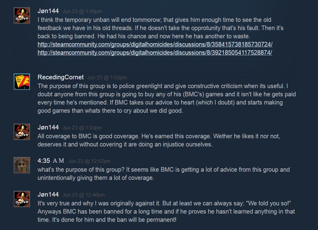 The Digital Homicides are happy to give developers advice on how to do Greenlight the right way, and a few developers even count themselves as members of the group. During our conversation, Tryyton stated multiple times that heâs happy when developers become âbetterâ after interacting with the Digital Homicides. Theyâve even tried to reach out to one of their arch-nemeses, BMC, on a few occasions. However, that didnât exactly end well: