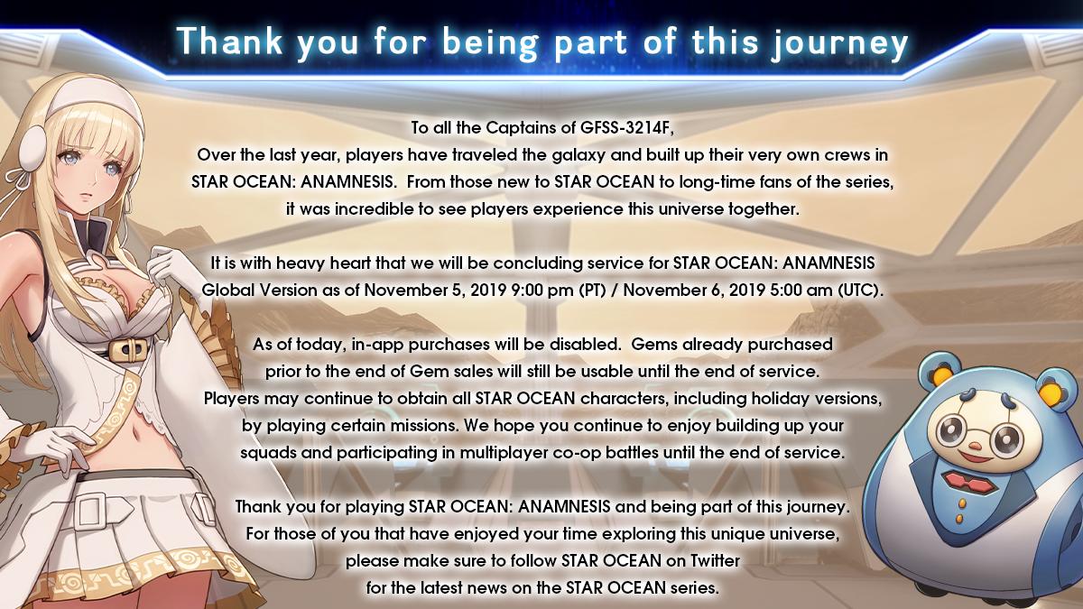 Star Ocean V was not good. Instead of Star Ocean VI, we got Star Ocean: Anamnesis, a mobile gacha game in which players collect characters and form fighting squads. Switching focus to mobile made fans sad, but the mobile game wasnât too bad. Just not good enough to continue. Square Enix announced the impending closure today via the gameâs official Twitter.