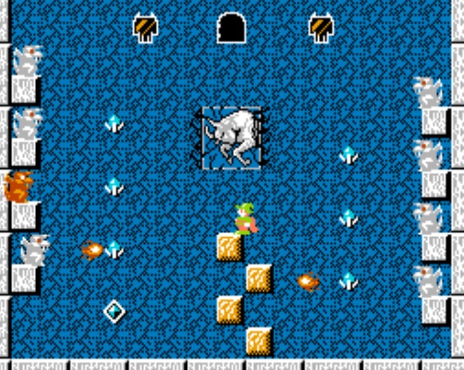 Tsuruta’s main work included the design and pixel art for the “main characters, monsters, and fairies.” Throughout the stages, gargoyles, dragons, and demon heads do their best to prevent Dana from escaping. An increase in obstacles and crafty wall placement make traversal arduous. Each room is a cosmological deathtrap that requires you to map out Dana’s route beforehand and put your reflexes and platforming skills to the ultimate test. Tsuruta took inspiration in his monster designs from Greek mythology as well as the film Jason and the Argonauts. “I think these are the basis of my drawing monsters. I also loved playing the game called Gauntlet at the time. The monsters in that game influenced me, too.”