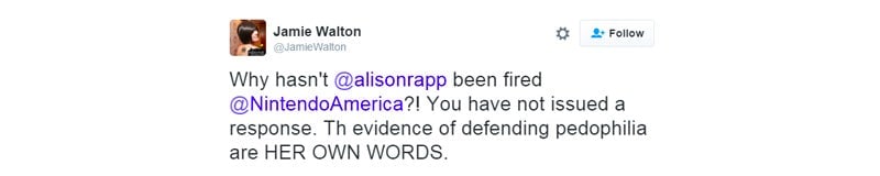 Walton claimed she spoke with Nintendo of America’s “supervisory line” and reported Rapp. She then retweeted voices of support from people, many who publicly associate with GamerGate, while saying she was “not GG” or “AGG” [anti GamerGate]. She added that she didn’t “suggest to @NintendoAmerica supervisors that @alisonrapp be fired,” but she “absolutely” thinks she should.