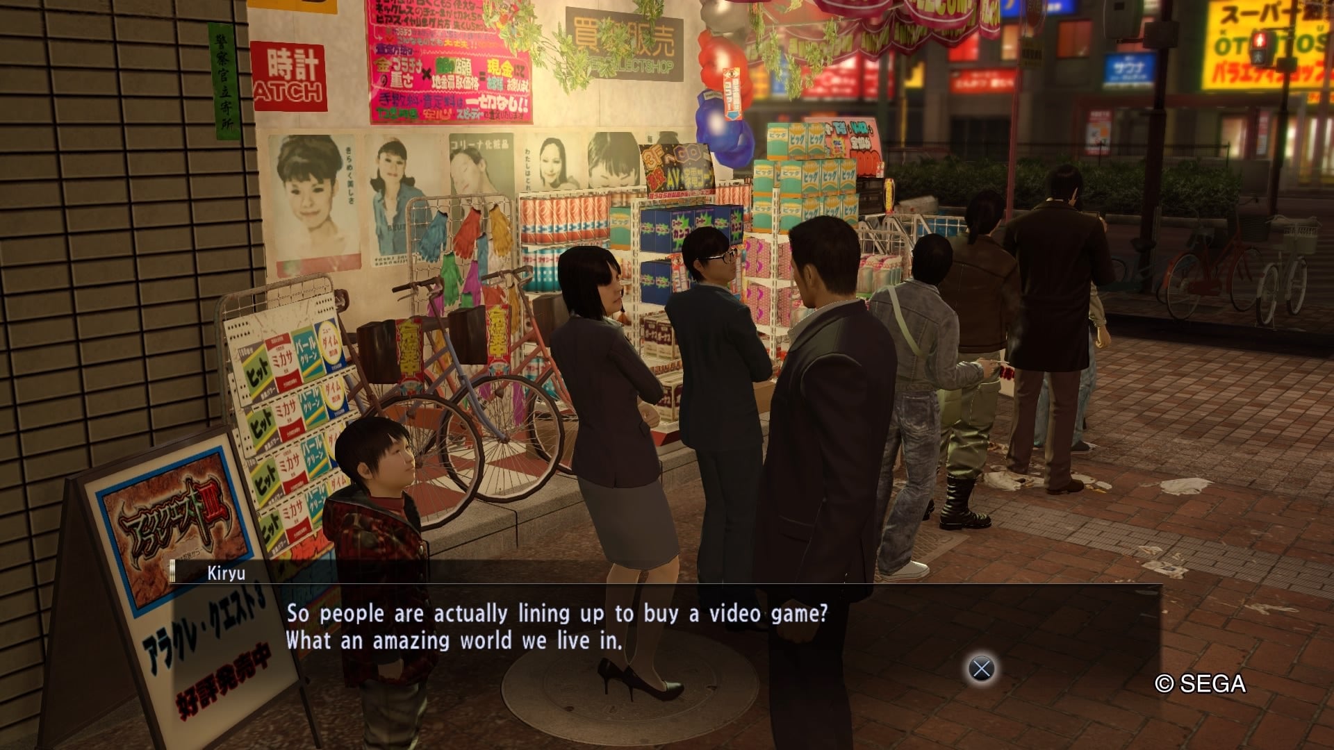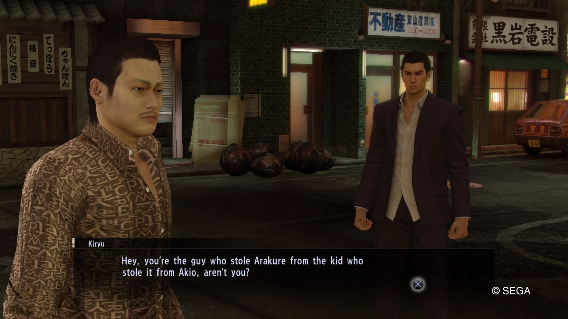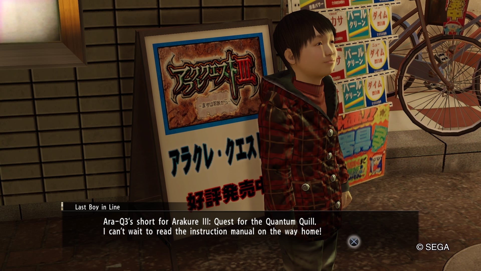 Kiryu responds to the negative, explaining that giving him the game is impossible because, “Long story short, you took Ara-Q3 from a wannabe punk who took it from a high school bully who took it from the last boy in line who bought it in the first place.”