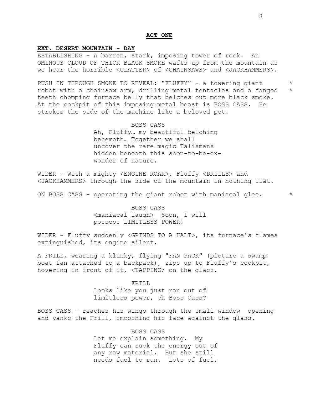 The first act of the pilot episode features the antagonist of the Ty games, Boss Cass, sitting inside a mech suit with a chainsaw. The mech, Fluffy, needs a lot of fossil fuels to run, so the evil cassowary decides to strip mine a mountain: