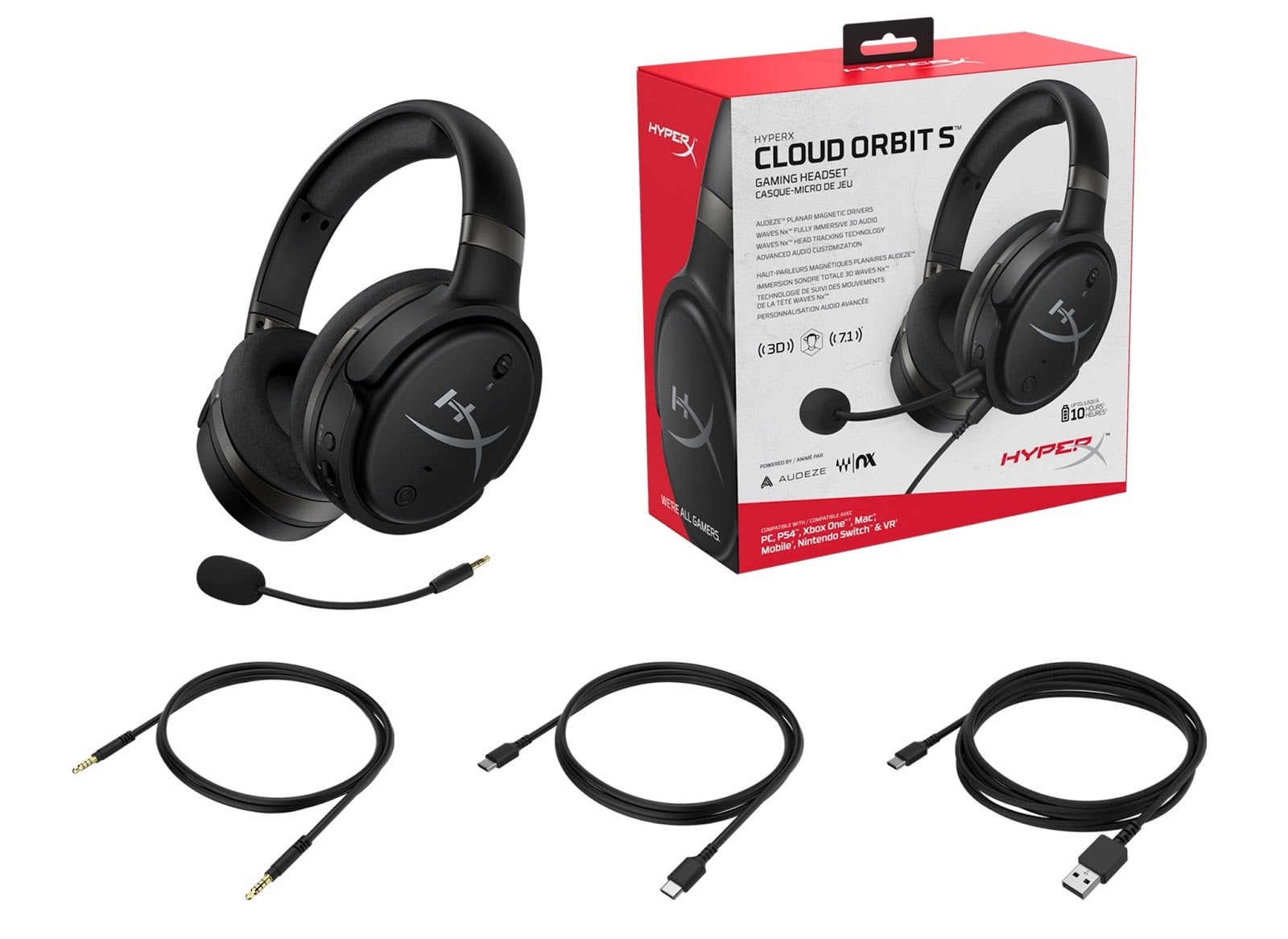 The HyperX Cloud Orbit S is also well-built and comfortable, with nice oval faux-leather ear cups and a fair bit of padding in the headband. It’s got on-ear controls for 3D audio, mic and headset volume control, and a switch for muting the mic altogether. It comes with two USB cables and a standard 3.5mm audio cable to connect to a wide variety of devices. It’s worth noting that the headset’s fancy planar magnetic drivers will not work without power, so if the headset is being used with the 3.5mm cable, it will require charging after about 10 hours running at mid-volume.