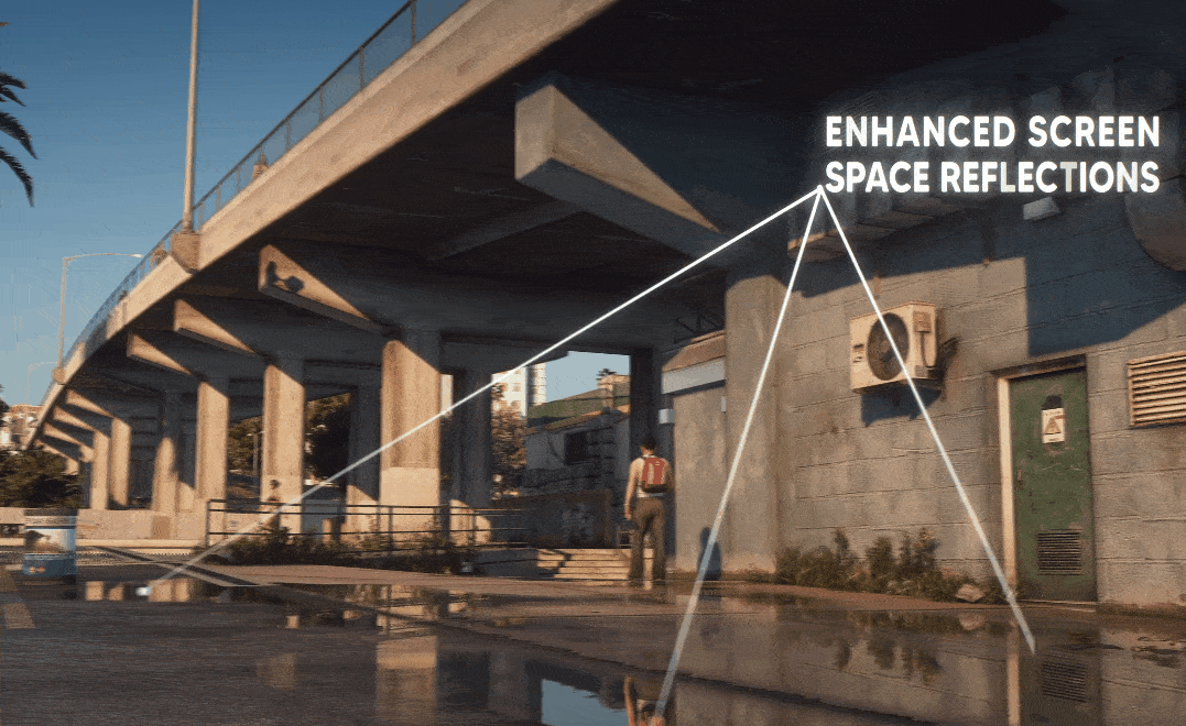 NaturalVision Evolved is a big leap forward for GTA V graphics mods. It adds entirely new textures to the game that help add more depth and realism to things like bricks and stone. It also features vastly improved real-time reflections with puddles now showing NPCs walking around. Lighting has also been improved, using raytraced global illumination.