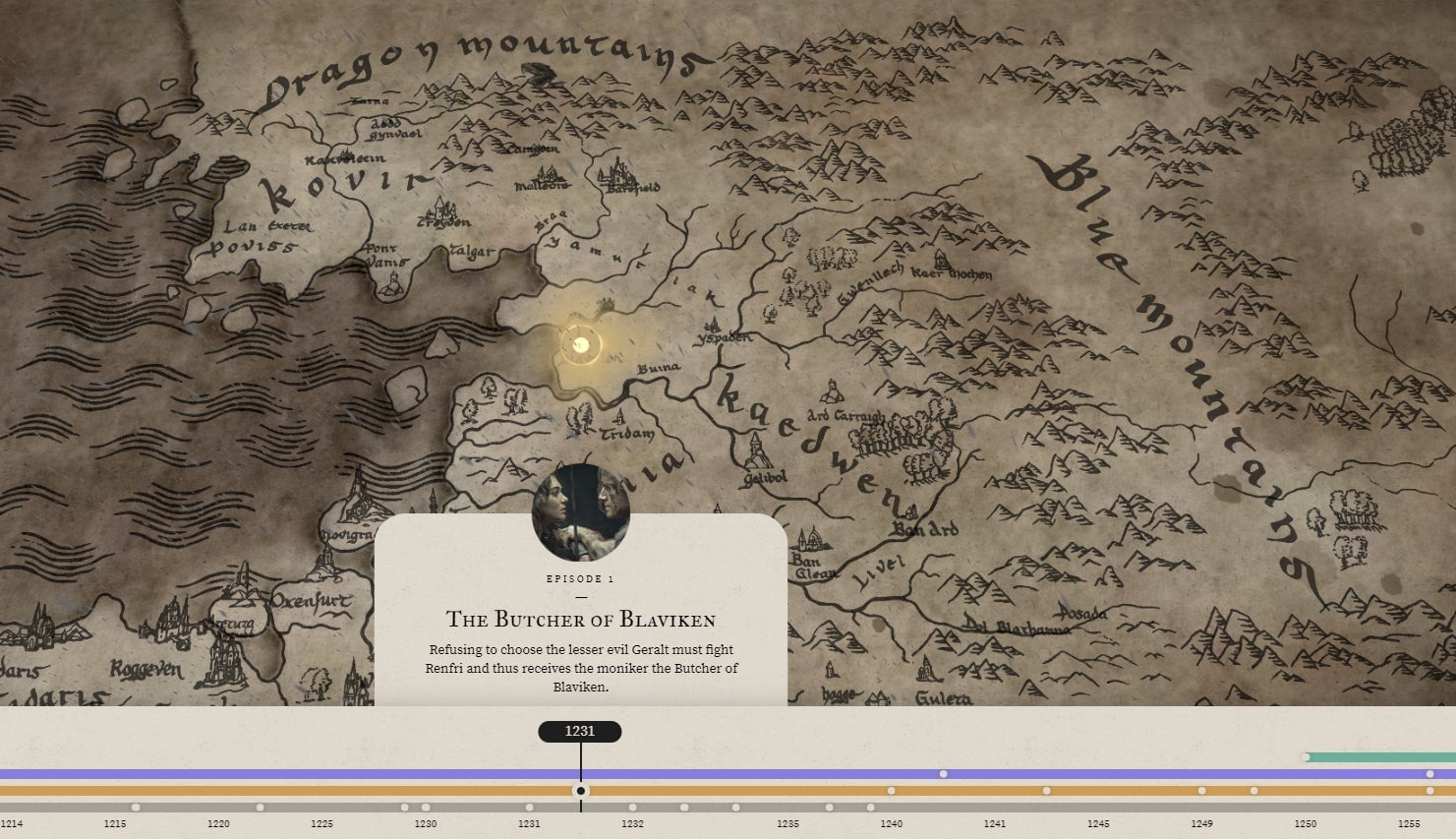 In addition to putting the scale of time involved in perspective, the timeline also shows where each of the events took place. The Kingdom of Cintra is big and the only buffer between Nilfgard and the Northern Kingdoms, which is why it matters so much. And there are some animations at each point on the timeline. When Geralt massacres a bunch of people in an accident that earns him the moniker “Butcher of Blaviken,” it’s raining, because you know, sad times.